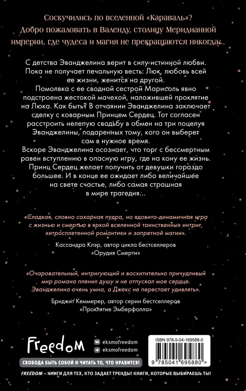 Эванджелина, мечтая об истинной любви, заключает отчаянную сделку с коварным Принцем Сердец: три поцелуя — за шанс разрушить чужую свадьбу. Но торг с бессмертным — это игра на жизнь и смерть, где наградою может стать и долгожданное «счастливо», и самая страшная трагедия.