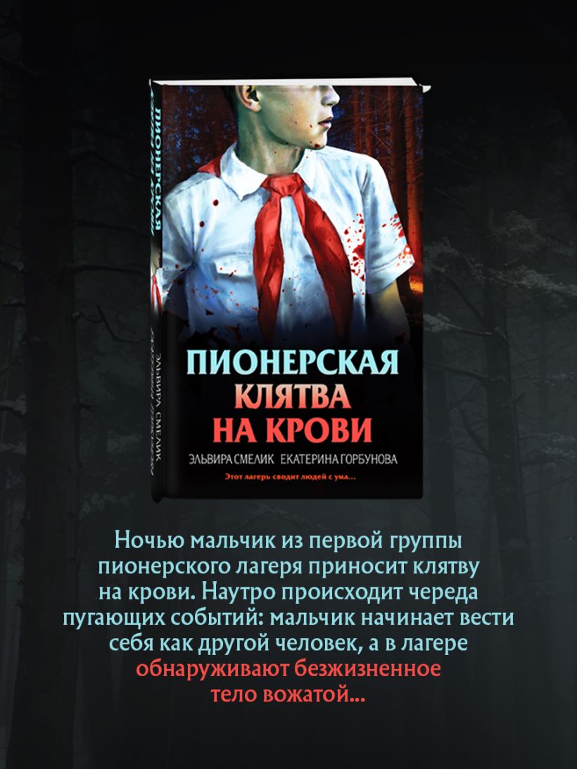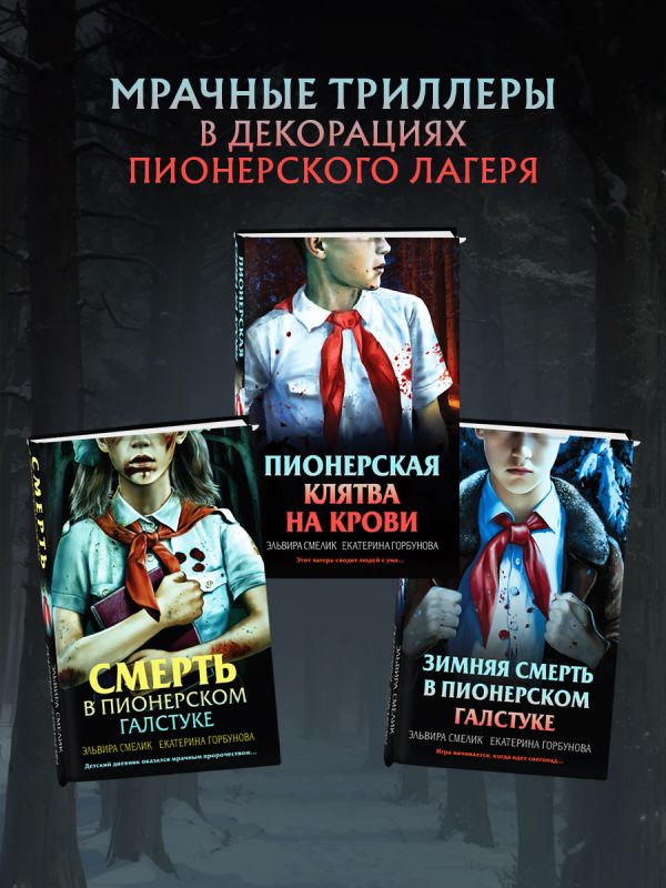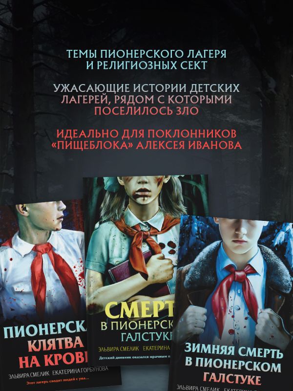 «Смерть в пионерском галстуке» Пионерский лагерь «Лесной» давно не принимает гостей. Когда-то здесь произошли странные вещи: сначала обнаружили распятую чайку, затем по ночам в лесу начали замечать загадочные костры и, наконец, куда-то стали пропадать вожатые и дети… Обнаружить удалось только ребят — опоенных отравой, у пещеры, о которой ходили страшные легенды. Лагерь закрыли навсегда. Двенадцать лет спустя в «Лесной» забредает отряд туристов: семеро ребят и двое инструкторов. Они находят дневник, где записаны жуткие события прошлого. Сначала эти истории кажутся детскими страшилками, но вскоре становится ясно: с лагерем что-то не так. Группа решает поскорее уйти, но… поздно. 12 лет назад из лагеря исчезли девять человек: двое взрослых и семеро детей. Неужели история повторится вновь? «Будоражащий воображение триллер, балансирующий на грани между мистикой и реальностью. Душевная история о дружбе, любви и силе духа, которые появляются в детстве и остаются с нами на долгие годы. Эта мрачная сказка затянет вас с головой и не отпустит до последней страницы...» — Лада Кутузова, писатель-сценарист, финалист Национальной премии в области детской и подростковой литературы, автор более 20 книг ТРИЛЛЕР В СЕТТИНГЕ ПИОНЕРСКОГО ЛАГЕРЯ. ИДЕАЛЬНО ДЛЯ ПОКЛОННИКОВ «ПИЩЕБЛОКА» АЛЕКСЕЯ ИВАНОВА. «Пионерская клятва на крови» Пионерский лагерь «Спутник» расположен у Чýдного озера, где, по легенде, на плавающем острове спрятан клад, а в лесу обитают духи нижнего мира. С первых дней ребятам третьей смены не по себе: в озере мерещатся утопленники, а «оживающие» деревья не дают выйти из леса. Ночью мальчики из первого отряда тайно выбираются к озеру. Там один из них приносит клятву на крови, чтобы удостоиться дружбы с лидером отряда. После чего… начинает вести себя как совершенно другой человек — из хлюпика и труса превращается в дерзкого и самоуверенного нахала. А наутро в лагере находят безжизненное тело вожатой… «Жуткая история, оставляющая после себя ощущение липкого страха по всему телу! Авторам удалось провести очень тонкую грань между уютной ностальгией по пионерским лагерям и мрачным, даже жестоким хоррором с толикой славянского фольклора и язычества». — Екатерина, автор телеграм-канала «Она любит книжки. И не только»