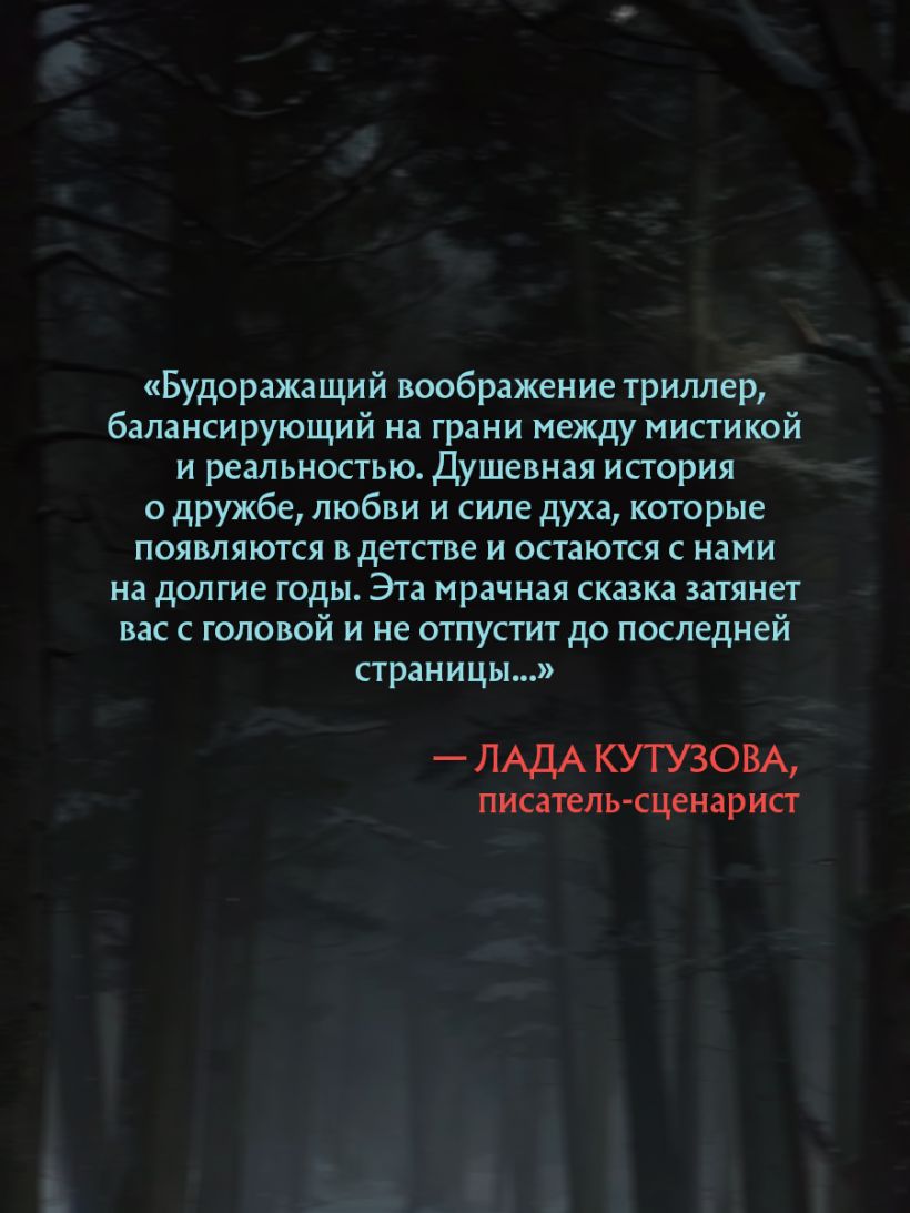 «Будоражащий воображение триллер, балансирующий на грани между мистикой и реальностью. Душевная история о дружбе, любви и силе духа, которые появляются в детстве и остаются с нами на долгие годы. Эта мрачная сказка затянет вас с головой и не отпустит до последней страницы...» — Лада Кутузова, писатель-сценарист, финалист Национальной премии в области детской и подростковой литературы, автор более 20 книг