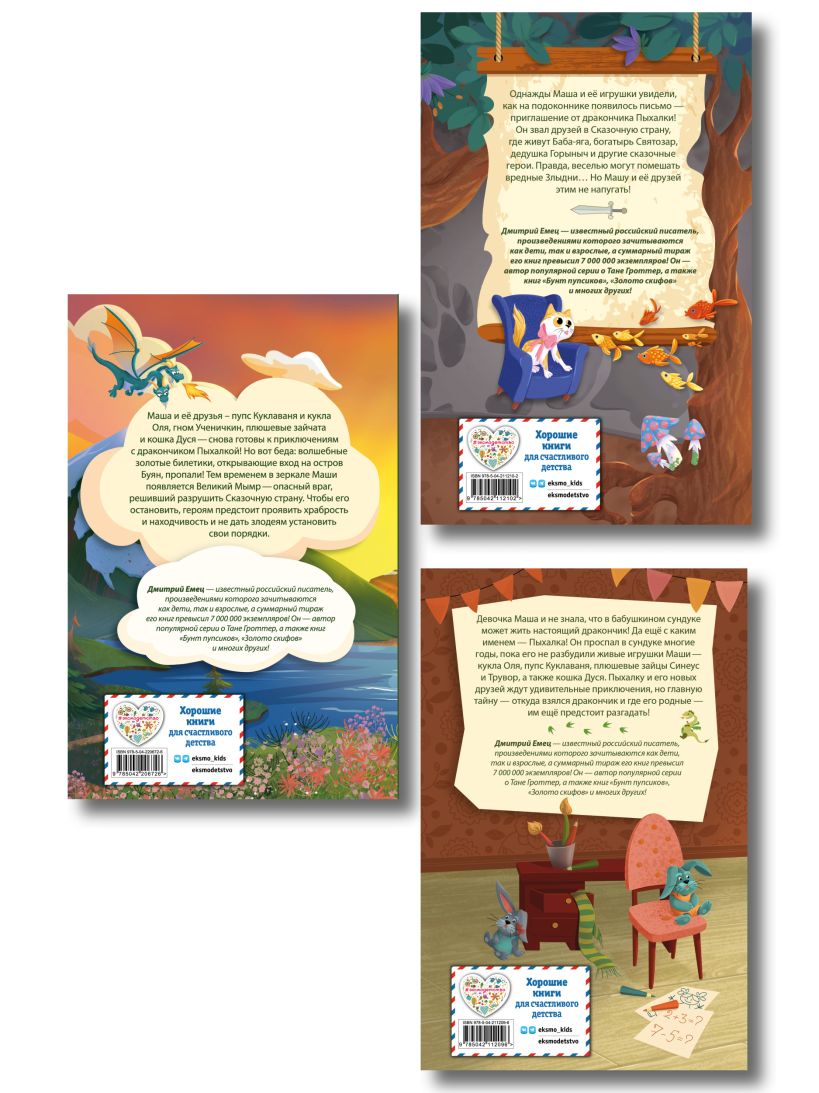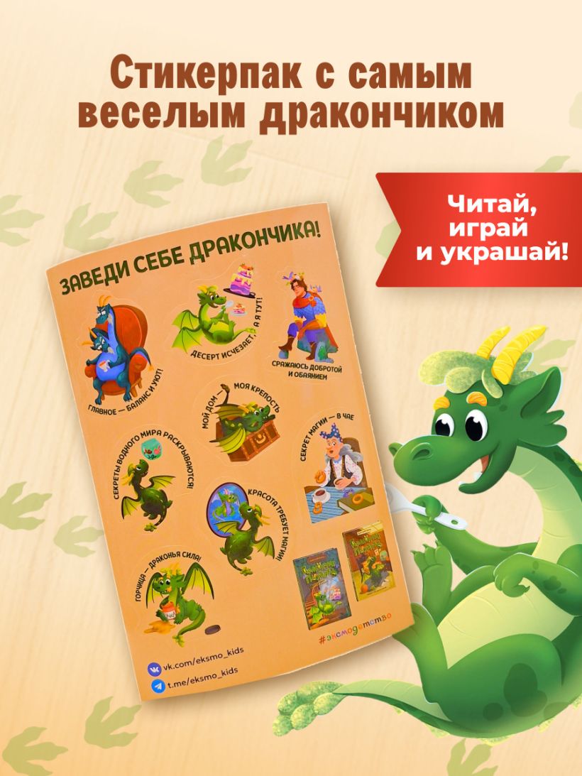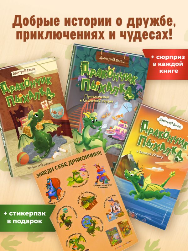 В комплект входят 3 книги Дмитрия Емца + тематический стикерпак: «Дракончик Пыхалка», «Дракончик Пыхалка. Приключения в Сказочной стране», «Дракончик Пыхалка и Великий Мымр».