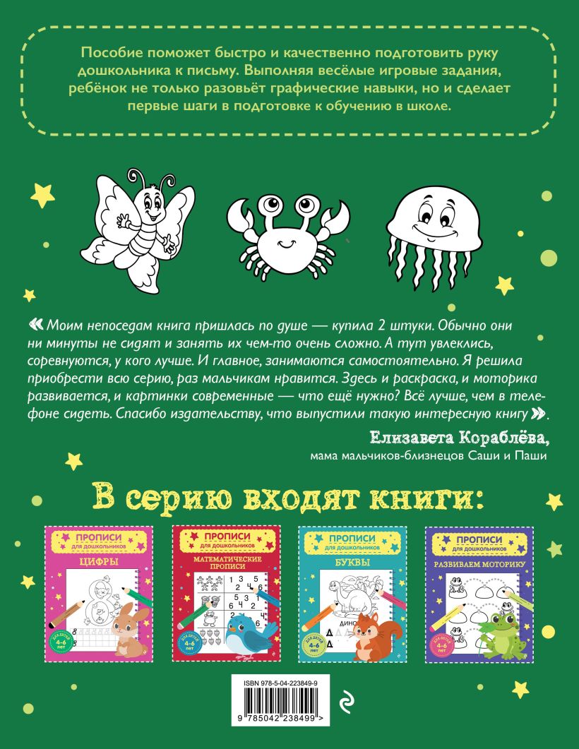 Современная школа предъявляет очень высокие требования к детям, которые поступают в 1 класс, поэтому дошкольная подготовка является важнейшим этапом для успешного старта. Эта развивашка, предназначенная для детей 5, 6, 7 лет, поможет ребенку научиться уверенно держать карандаш и ручку в руках. Тетрадь содержит более 150 увлекательных заданий. Каждая страница тренажера предлагает множество интересных и разнообразных упражнений, которые помогут не только развить мелкую моторику, но также узнать и научиться писать буквы. Кроме того, пособие содержит прописи для дошкольников, детские развивающие игры, такие как лабиринты, раскраски, задания на штриховку, рисование линий, узоров, а также упражнения на развитие и тренировку воображения, моторики, логики, внимания и мышления. Занимаясь, ребенок будет активно готовиться к школе. Все, что для этого нужно — цветные карандаши и хорошее настроение! Книга для малышей от издательства «Эксмо» станет прекрасным помощником для родителей и отличным подарком для мальчиков и девочек!