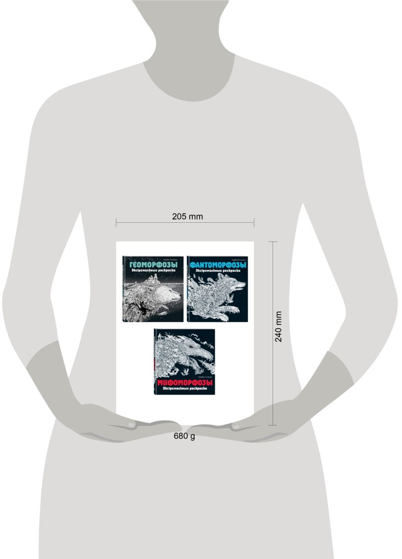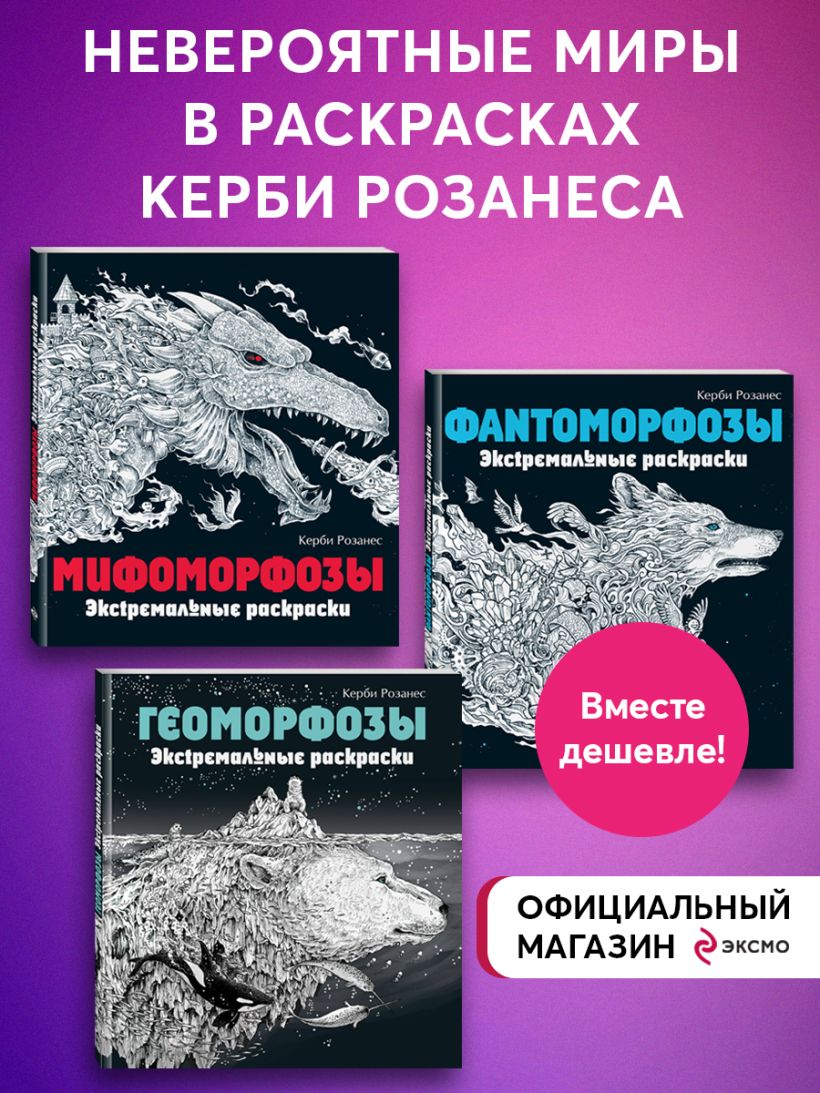 Комплект из 3 раскрасок-антистресс: "Геоморфозы. Экстремальные раскраски", "Мифоморфозы. Экстремальные раскраски" и "Фантоморфозы. Экстремальные раскраски". На каждой странице книги - невероятные, изящные иллюстрации, которые погружают каждого в удивитедьный мир фантазий.