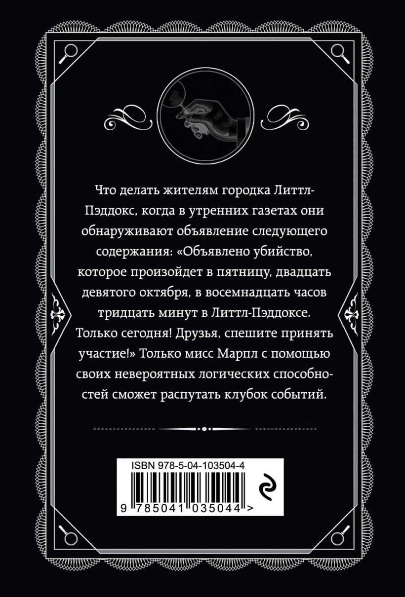 Что делать жителям городка Литтл-Пэддокс, когда в утренних газетах они обнаруживают объявление следующего содержания: «Объявлено убийство, которое произойдет в пятницу, двадцать девятого октября, в восемнадцать часов тридцать минут, в Литтл-Пэддоксе. Только сегодня! Друзья, спешите принять участие!» Только мисс Марпл с помощью своих невероятных логических способностей сможет распутать клубок событий.