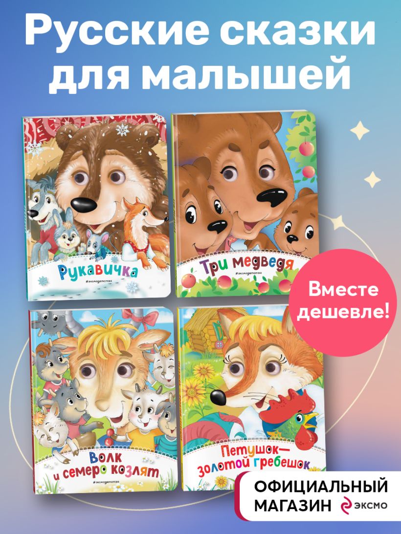 Русские народные сказки представлены в самом удобном для малышей формате — прочные картонные страницы, закруглённые края, красочные иллюстрации. А чтобы ребёнку было ещё интересней знакомиться с историей, на каждом развороте у героя есть подвижные пластиковые глазки.