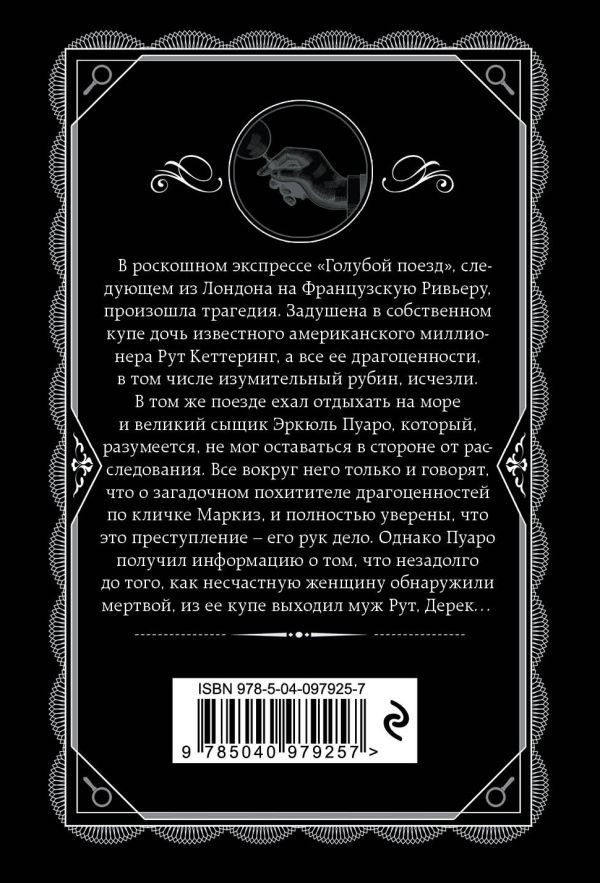 В роскошном экспрессе "Голубой поезд", следующем из Лондона на Французскую Ривьеру, произошла трагедия. Задушена в собственном купе дочь известного американского миллионера Рут Кеттеринг, а все ее драгоценности, в том числе изумительный рубин, исчезли. В том же поезде ехал отдыхать на море и великий сыщик Эркюль Пуаро, который, разумеется, не мог оставаться в стороне от расследования. Все вокруг него только и говорят, что о загадочном похитителе драгоценностей по кличке Маркиз, и полностью уверены, что это преступление – его рук дело. Однако Пуаро получил информацию о том, что незадолго до того, как несчастную женщину обнаружили мертвой, из ее купе выходил муж Рут, Дерек…