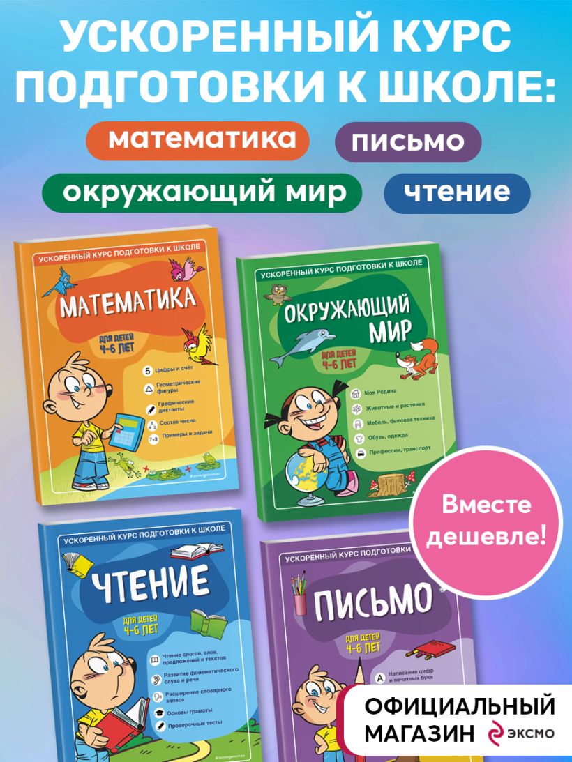 В основу комплекта книг от издательства «Эксмо», состоящего из 4-х цветных пособий, положена уникальная авторская методика, апробированная в детском эко-клубе «Умничка» и гарантирующая высокий результат без помощи репетиторов! Для того чтобы быстро и качественно подготовить ребенка к школе, авторы отобрали самые важные и нужные темы по математике (состав числа, решение примеров и задач, сравнение предметов и чисел) и по окружающему миру. Занимаясь, ребенок совершит много интересных открытий и сможет упорядочить уже имеющиеся у него знания. Для обучения чтению используется классическая схема: буквы — слоги — слова — предложения — тексты, а для обучения письму: разные типы линий — полуовалы — овалы — круги — печатные буквы и цифры — элементов письменных букв.