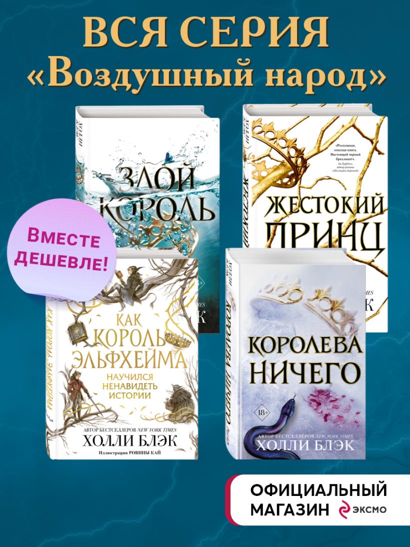 Комплект из четырех книг Холли Блэк: "Воздушный народ. Жестокий принц", "Воздушный народ. Злой король", "Воздушный народ. Королева ничего", "Как король Эльфхейма научился ненавидеть истории".
