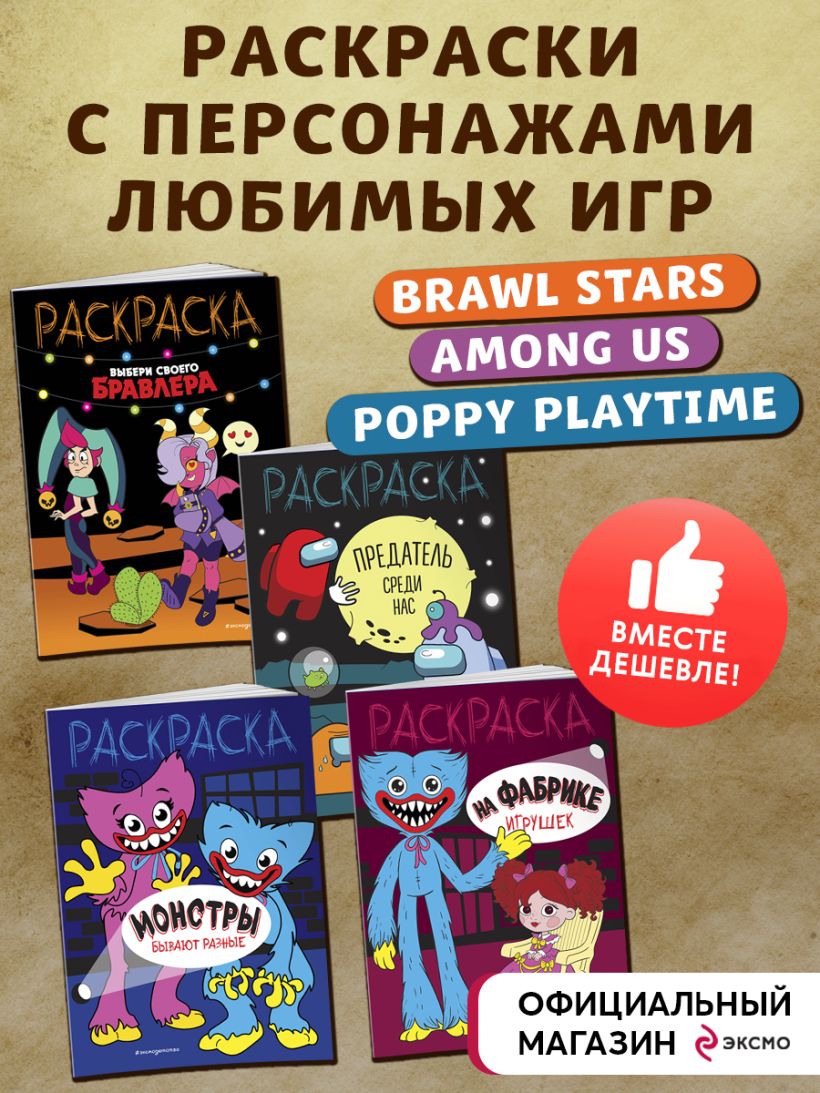 Невероятно крутой комплект, состоящий из раскрасок «Выбери своего бравлера», «Монстры бывают разные», «На фабрике игрушек» и «Предатель среди нас», созданных по мотивам твоих самых любимых игр!