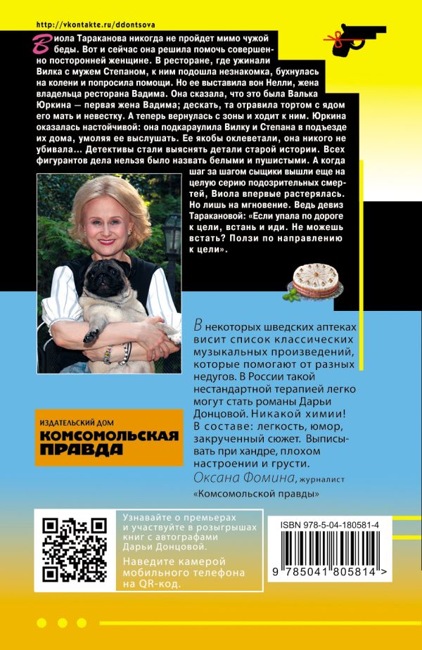 Если ты кому-то помог, то постарайся побыстрее удрать от карающего меча благодарности. Евлампии Романовой порой кажется, что она живет в палатке на вершине вулкана и постоянно оказывается в потоке лавы. Вот и сейчас к ее подруге соседке неожиданно приехала свекровь, которую невестка знать не знает, а сын не видел много лет. Лампа решает помочь Гортензии более чем оригинальным образом, и дома у Романовой теперь полный кавардак. Но у судьбы на Лампу другие планы: на работе возникло крайне запутанное дело. В агентство Вульфа обратился Василий Светов и попросил найти своего друга — бизнесмена Сергея Акулова, который вроде бы умер, а вроде бы и нет… Дарья Донцова — самый популярный и востребованный автор в нашей стране, любимица миллионов читателей. В России продано более 200 миллионов экземпляров ее книг. Ее творчество наполняет сердца и души светом, оптимизмом, радостью, уверенностью в завтрашнем дне! «Донцова невероятная работяга! Я не знаю ни одного другого писателя, который столько работал бы. Я отношусь к ней с уважением, как к образцу писательского трудолюбия. Женщины нуждаются в психологической поддержке и получают ее от Донцовой. Я и сама в свое время прочла несколько романов Донцовой. Ее читают очень разные люди. И очень занятые бизнес-леди, чтобы на время выключить голову, и домохозяйки, у которых есть перерыв 15—20 минут между отвести-забрать детей». — Галина Юзефович, литературный критик