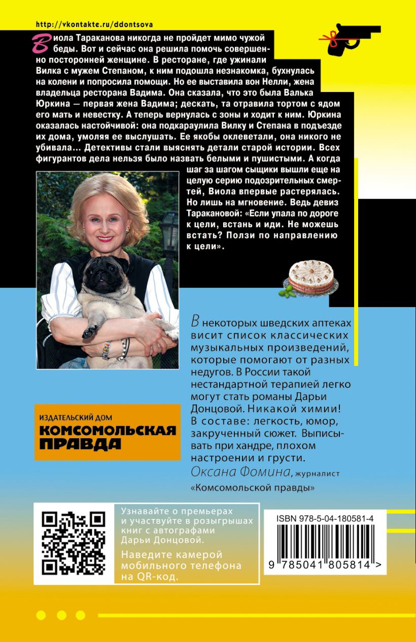 Если любишь человека, то люби и его личных тараканов. Даша Васильева давно живет по этому правилу, а вот жена полковника Дегтярева Марина — нет. В этот раз он зашел слишком далеко: своими капризами сильно обидел свою вторую половину. Даша попыталась помирить пару, но этому помешала новая клиентка детективного агентства Людмила Косина. Она попросила подтвердить свои подозрения в отношении убийцы ее сестры Надежды Бовари. Врачи заявили, что женщина умерла от инсульта. Однако нанятый Косиной суперэксперт обнаружил, что Бовари была отравлена ядом экзотической гусеницы. И вот этот же яд был обнаружен в креме, который накануне подарила покойной… первая жена Надиного мужа Ольга! Плевое дело, преступник почти найден. Сыщики с энтузиазмом взялись за работу. Тем сильнее был шок, когда они поняли, что все время шли по ложному следу! Дарья Донцова — самый популярный и востребованный автор в нашей стране, любимица миллионов читателей. В России продано более 200 миллионов экземпляров ее книг. Ее творчество наполняет сердца и души светом, оптимизмом, радостью, уверенностью в завтрашнем дне! «Донцова невероятная работяга! Я не знаю ни одного другого писателя, который столько работал бы. Я отношусь к ней с уважением, как к образцу писательского трудолюбия. Женщины нуждаются в психологической поддержке и получают ее от Донцовой. Я и сама в свое время прочла несколько романов Донцовой. Ее читают очень разные люди. И очень занятые бизнес-леди, чтобы на время выключить голову, и домохозяйки, у которых есть перерыв 15—20 минут между отвести-забрать детей». — Галина Юзефович, литературный критик