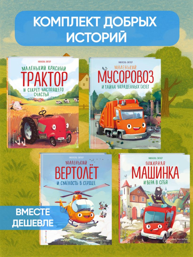 Комплект из 4 книг Михаэля Энглера про маленький красный Трактор и другие машинки: "Маленький красный Трактор и секрет настоящего счастья", "Пожарная машинка и вера в себя", "Маленький мусоровоз и тайна украденных газет", "Маленький вертолёт и смелость в сердце".