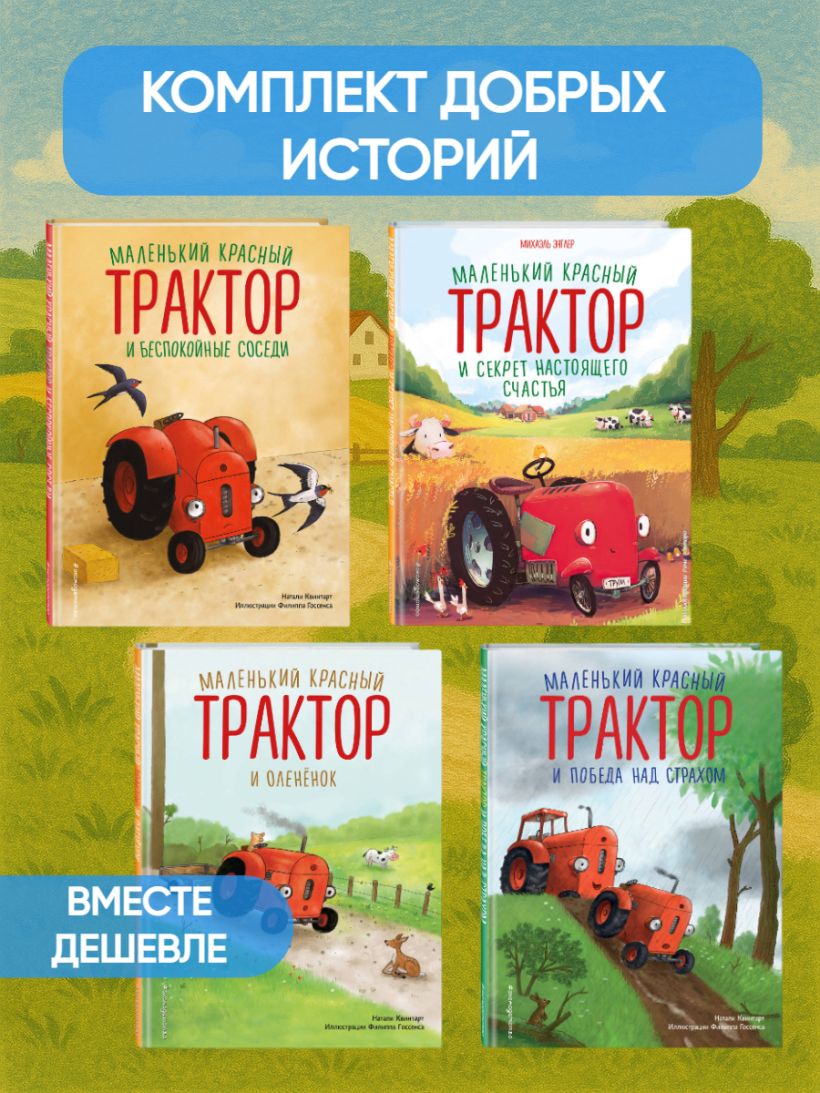 Комплект из 4 книг Натали Квинтарт и Михаэля Энглера с лучшими исторями о доброте: "Маленький красный Трактор и победа над страхом", "Маленький красный Трактор и беспокойные соседи", "Маленький красный Трактор и секрет настоящего счастья", "Маленький красный Трактор и оленёнок".