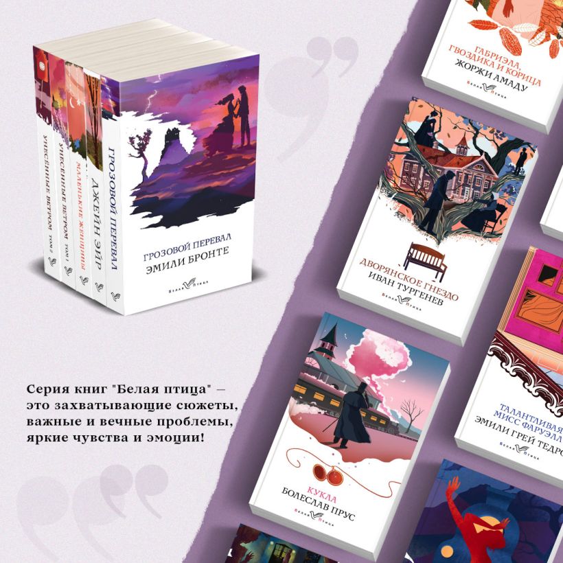 Комплект из пяти книг-бестселлеров серии «Белая птица» («Грозовой перевал», «Джейн Эйр», «Маленькие женщины», «Унесенные ветром» Том 1 и Том 2) в твердом переплете и подарочном серийном коробе.