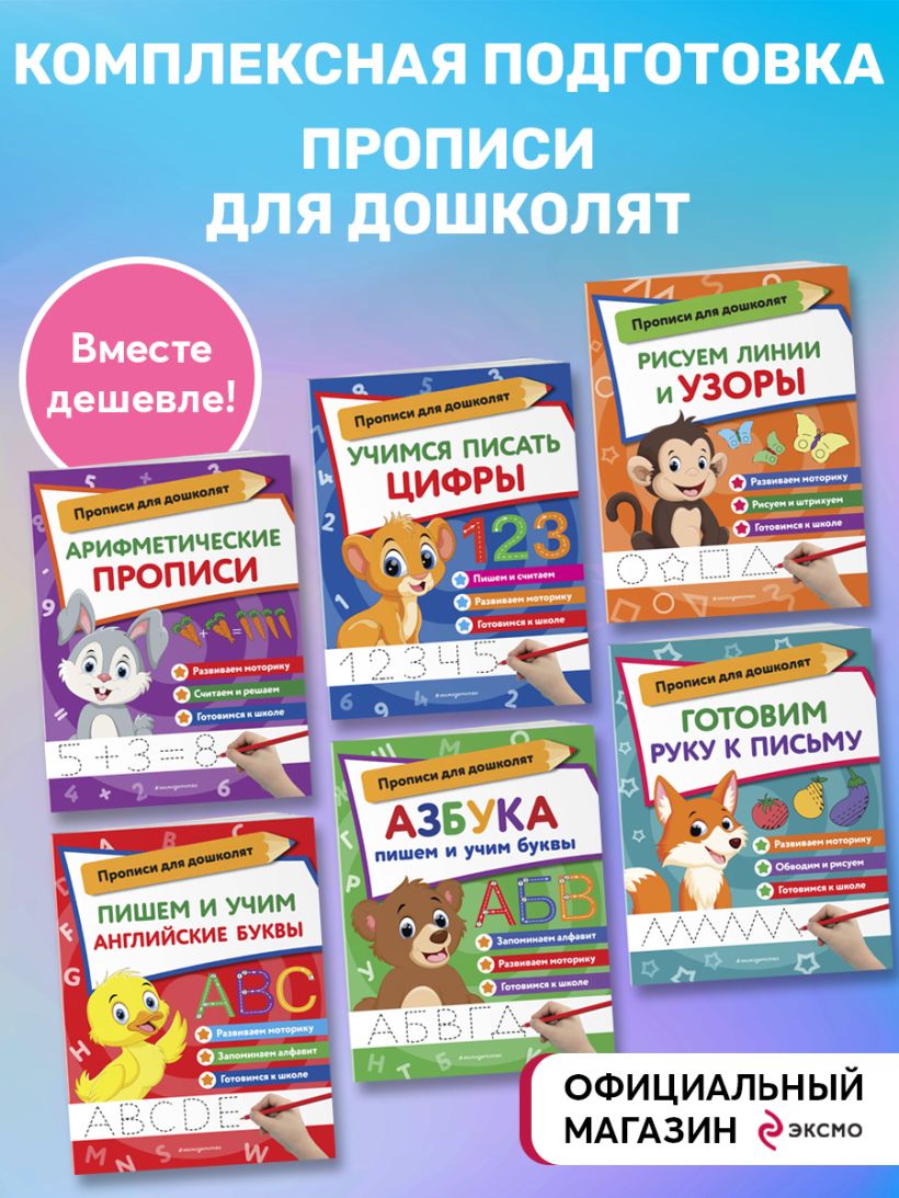 Цель обучающего комплекта книг от издательства «Эксмо», состоящего из 6 пособий большого формата по 32 страницы каждое, — не только помочь ребенку развить мелкую моторику и отработать навык письма, но и потренироваться в счете, решении примеров, сравнении, написание цифр и букв русского и английского алфавитов, рисовании узоров, штриховке. Забавные позитивные картинки доставят детям удовольствие и будут способствовать получению высокого результата. Кроме того, прописи помогут развить у ребенка навык чистописания и орфографическую зоркость, которые являются важнейшим условием грамотного письма, а также усидчивость, внимание и терпение — качества, которые очень важны как для подготовки к школе, так и для дальнейшего обучения.