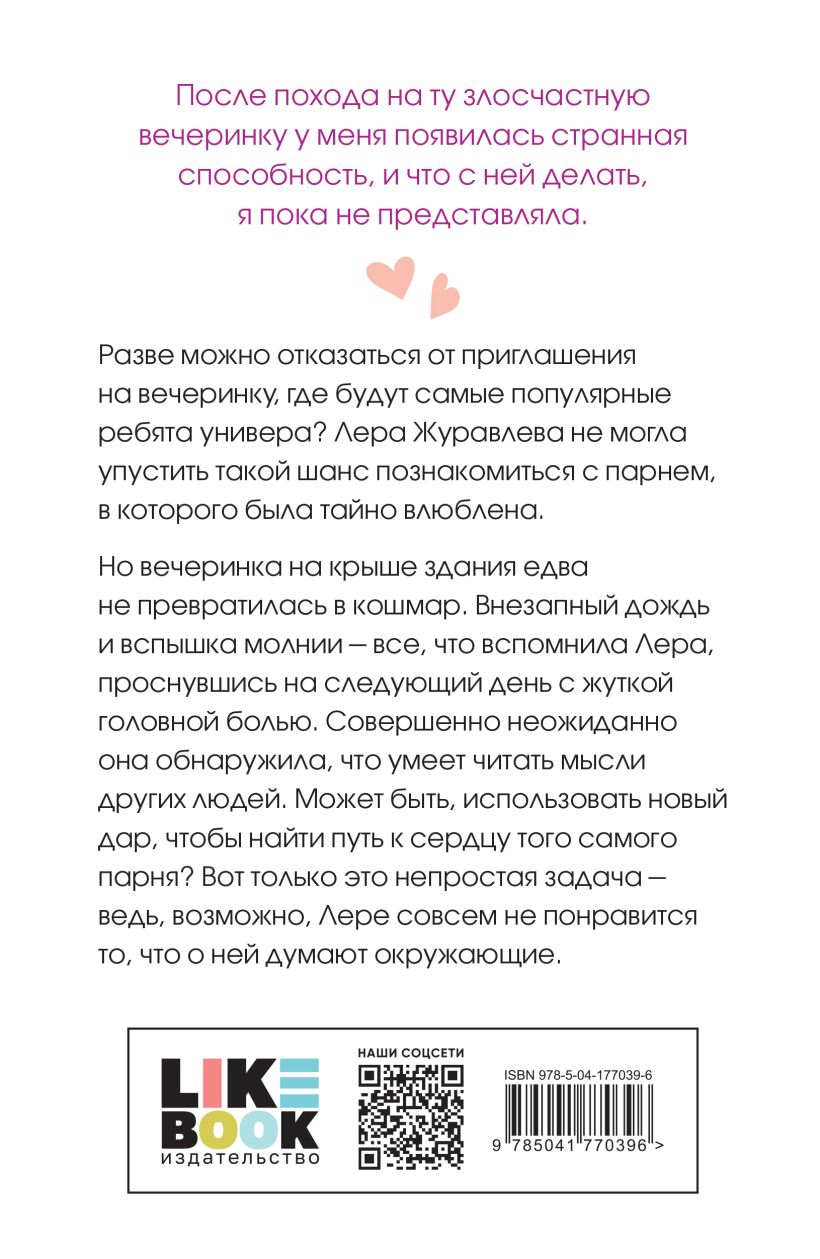 Но вечеринка на крыше здания едва не превратилась в кошмар. Внезапный дождь и вспышка молнии — все, что вспомнила Лера, проснувшись на следующий день с жуткой головной болью. Совершенно неожиданно она обнаружила, что умеет читать мысли других людей. Может быть, использовать новый дар, чтобы найти путь к сердцу того самого парня? Вот только это непростая задача — ведь, возможно, Лере совсем не понравится то, что о ней думают окружающие.