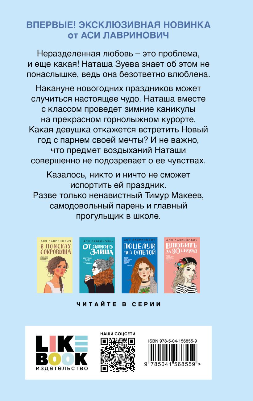 ЗИМНЯЯ НОВИНКА ОТ АСИ ЛАВРИНОВИЧ, САМОГО ПОПУЛЯРНОГО СОВРЕМЕННОГО ЯНГ-ЭДАЛТ АВТОРА! Суммарный тираж ее книг уже более 1 МИЛЛИОНА проданных экземпляров! Один зимний бал. Одна милая карликовая свинка. И одна маленькая ложь, которая перевернет все с ног на голову. Этот Новый год станет незабываемым! У Теоны Берая есть все, о чем может мечтать старшеклассница: верные подруги, популярность в школе, хорошая внешность и отличная успеваемость. А недавно ее пригласил на ежегодный бал самый популярный парень в классе. Когда у ее отца возникают серьезные проблемы на работе, Теона вынуждена переехать в другой город к сводной старшей сестре, которую она совсем не знает. Все планы рушатся в одночасье. В новой школе Теона знакомится с незаметной Ясей Дзвоник и загадочным и неразговорчивым Тихоном Барко. Узнав о давнем желании Яси стать популярной, Теона решается на эксперимент. Ей предстоит «перевоспитать» тихоню и сделать из нее звезду, а Тихона заставить встречаться с королевой школы. Вот так задачка! Об авторе Ася Лавринович — один из самых популярных авторов российского янг-эдалта в жанре современной сентиментальной прозы. Суммарный тираж ее проданных книг составляет более 1 млн экземпляров. Победитель премии «Выбор читателей 2023» на Livelib в номинации «Young Adult. Лучшая книга о подростках и для подростков». На две книги Аси — «Загадай любовь» и «Нелюбовь сероглазого короля» — куплены права на экранизацию от ОККО.