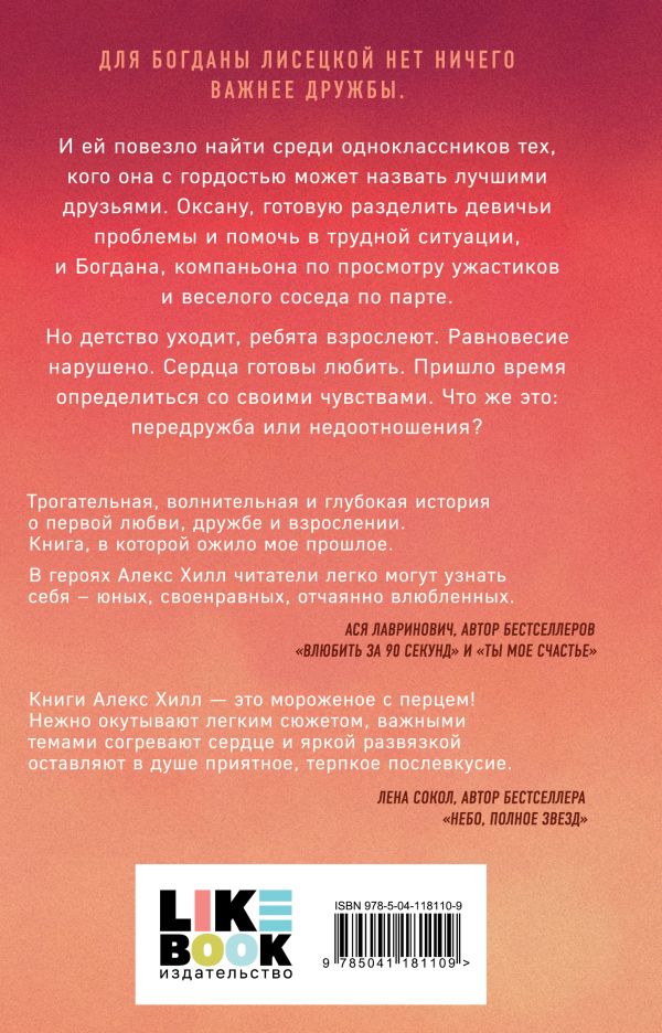 ПОДАРОЧНОЕ ИЗДАНИЕ КНЖИНОГО ХИТА «ПЕРЕДРУЖБА. НЕДООТНОШЕНИЯ» ОТ АЛЕКС ХИЛЛ! Дополненный текст, новые сцены и главы, комментарии от героев истории и самого автора, интересные факты и шутки на полях. Я готов быть для нее кем угодно, лишь бы рядом, лишь бы она улыбалась и была счастлива. Рано или поздно настает пора, когда наше сердце готово любить. Для Богданы Лисецкой нет ничего важнее дружбы. И ей повезло найти среди одноклассников тех, кого она с гордостью может назвать лучшими друзьями. Оксану, готовую разделить девичьи проблемы и помочь в трудной ситуации, и Богдана, компаньона по просмотру ужастиков и веселого соседа по парте. Но детство уходит, ребята взрослеют. Равновесие нарушено. Сердца готовы любить. Пришло время определиться со своими чувствами. Что же это: передружба или недоотношения? Нежность и трепет первой любви, от друзей к возлюбленным, любовный треугольник, последний год школы, взросление. Яркий слог автора, любимые персонажи, красивое художественное оформление, закрашенный обрез, креативная верстка с комментариями от автора, интересными фактами, шутками, фразами от героев истории. «Передружба. Недоотношения» — романтический книжный хит в Young Adult. «Улыбки, слезы, мурашки, волнение… Книги Алекс Хилл – настоящий коктейль из эмоций. «Передружба» – искренняя история об отношениях, выборе и внутреннем росте персонажей. Каждый читатель сможет узнать в молодых героях себя.» - Ася Лавринович, писательница. Читайте книги автора: «Передружба. Второй шанс», «Передружба. Поймать свободу», «Худшие подруги», «Она мне не сестра», «Метод книжной героини», «Она любит плохих парней», «После тебя только пепел», «Найди пять отличий», «Это всегда был он», «Это снова ты», «Риша решает!», «Почему нет?», «Без любви не считается». Для поклонников историй Аси Лавринович, Анны Джейн и Даны Делон. Приятная на ощупь бумага, креативная верстка от Киры Мори, обложка от известного молодежного художника Alen Min, закрашенный обрез.