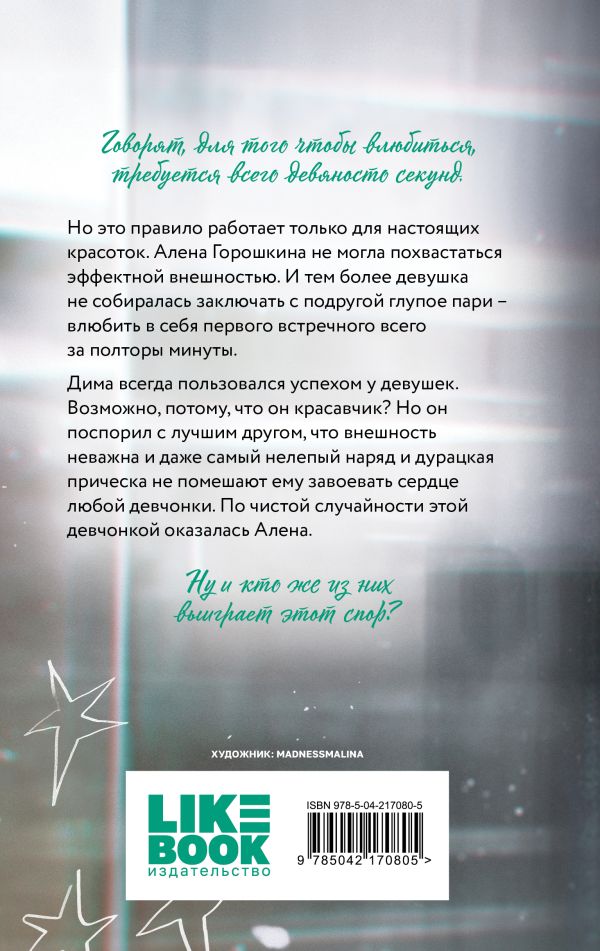 Алена Горошкина не могла похвастаться эффектной внешностью. И тем более девушка не собиралась заключать с подругой глупое пари - влюбить в себя первого встречного всего за полторы минуты.
