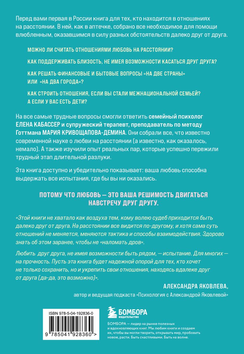 Любить друг друга не имея возможности быть рядом — испытание. Для многих — на прочность. Пусть эта книга будет надежной опорой для тех, кто хочет не только сохранить, но и укрепить свои отношения, находясь вдалеке друг от друга (да-да, это возможно)». — Александра Яковлева, автор и ведущая подкаста «Психология с Александрой Яковлевой»