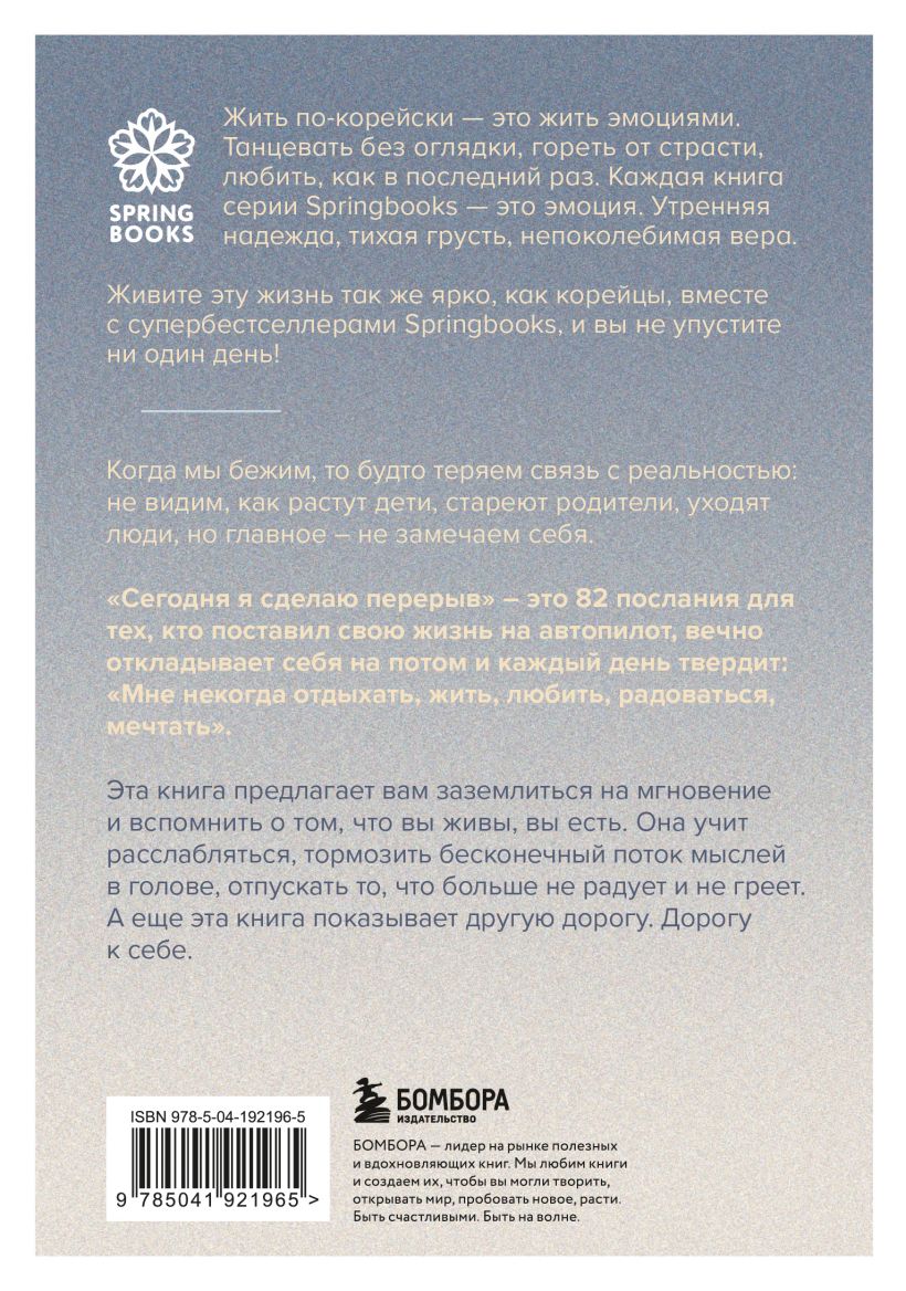 “Сегодня я сделаю перерыв” – это 82 послания для тех, кто поставил свою жизнь на автопилот, вечно откладывает себя на потом и каждый день твердит: “Мне некогда отдыхать, жить, любить, радоваться, мечтать”.