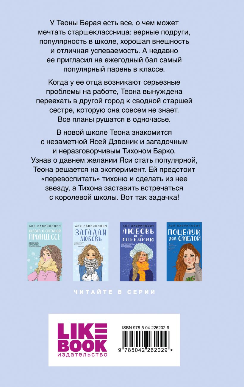 ЗИМНЯЯ НОВИНКА ОТ АСИ ЛАВРИНОВИЧ, САМОГО ПОПУЛЯРНОГО СОВРЕМЕННОГО ЯНГ-ЭДАЛТ АВТОРА! Суммарный тираж ее книг уже более 1 МИЛЛИОНА проданных экземпляров! Один зимний бал. Одна милая карликовая свинка. И одна маленькая ложь, которая перевернет все с ног на голову. Этот Новый год станет незабываемым! У Теоны Берая есть все, о чем может мечтать старшеклассница: верные подруги, популярность в школе, хорошая внешность и отличная успеваемость. А недавно ее пригласил на ежегодный бал самый популярный парень в классе. Когда у ее отца возникают серьезные проблемы на работе, Теона вынуждена переехать в другой город к сводной старшей сестре, которую она совсем не знает. Все планы рушатся в одночасье. В новой школе Теона знакомится с незаметной Ясей Дзвоник и загадочным и неразговорчивым Тихоном Барко. Узнав о давнем желании Яси стать популярной, Теона решается на эксперимент. Ей предстоит «перевоспитать» тихоню и сделать из нее звезду, а Тихона заставить встречаться с королевой школы. Вот так задачка! Об авторе Ася Лавринович — один из самых популярных авторов российского янг-эдалта в жанре современной сентиментальной прозы. Суммарный тираж ее проданных книг составляет более 1 млн экземпляров. Победитель премии «Выбор читателей 2023» на Livelib в номинации «Young Adult. Лучшая книга о подростках и для подростков». На две книги Аси — «Загадай любовь» и «Нелюбовь сероглазого короля» — куплены права на экранизацию от ОККО.