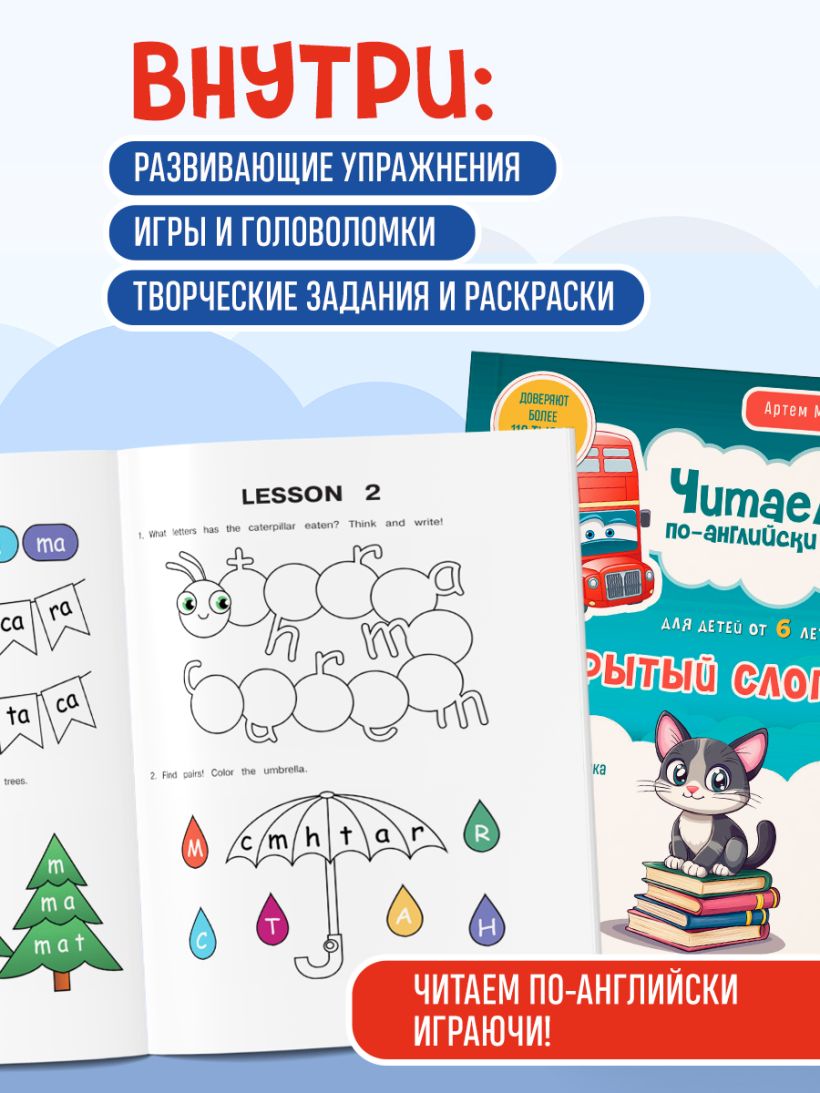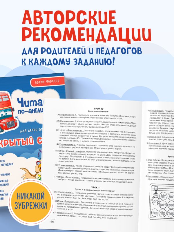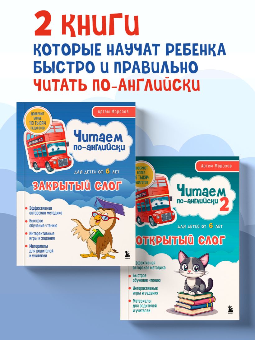 Комлпект книг "Читаем по-английски. Закрытый и открытый слог" включает две части из цикла обучающих книг по чтению для детей от Артема Морозова. Новаторской методике сертифицированного преподавателя с квалификацией DELTA Кембриджского Университета доверяют более 119 тысяч педагогов и родителей. Благодаря разнообразным упражнениям, развивающим мелкую моторику, воображение и пространственное мышление, а также отказу от транскрипции обучение приносит ребятам удовольствие, и результат не заставляет себя долго ждать.