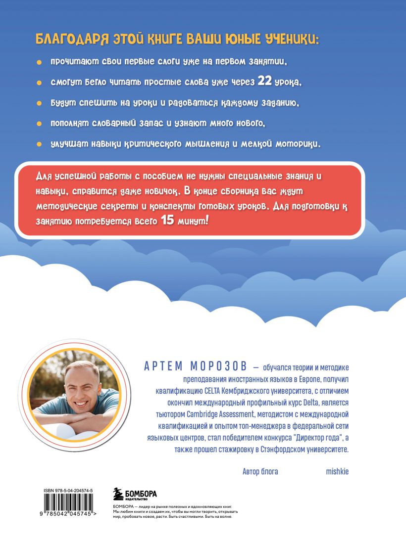 Третья книга по чтению для детей от Артема Морозова, основателя успешного проекта Mishkie и сертифицированного преподавателя, посвящена буквосочетаниям! Уникальная авторская методика завоевала доверие более 120 тысяч педагогов и родителей. Забудьте о перегрузке детей запоминанием букв и сложной транскрипции! Артем Морозов предлагает простой и эффективный подход, который убирает искусственные барьеры и значительно ускоряет образовательный процесс. В книге вы найдете уникальные упражнения, развивающие мелкую моторику, воображение и пространственное мышление. Яркие и красочные иллюстрации, созданные автором для каждого урока, сделают обучение увлекательным и интересным. В конце вас ждут ценные рекомендации и советы по проведению уроков в игровом формате. Это поможет каждому преподавателю и родителю заинтересовать детей и быстро научить их чтению. Пособие идеально подойдет для занятий с учениками младшей школы и дошкольниками. Не упустите шанс подарить вашему ребенку радость чтения!