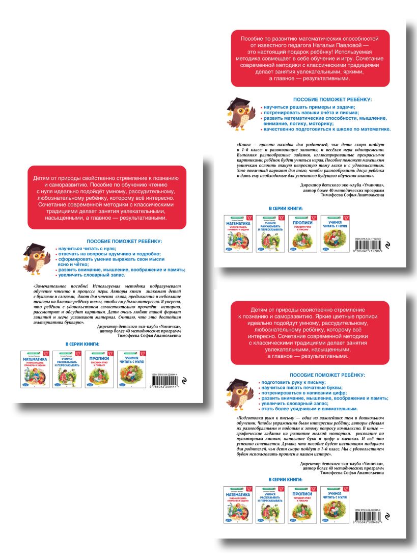 С помощью «Математики» для малышей можно всего за месяц занятий освоить сложение и вычитание, научиться записывать решение задач, развить логику и внимание, потренировать мелкую моторику, а также овладеть навыками счёта и письма. Книга по чтению поможет научиться бегло и осознанно читать, понимать прочитанное, расширить словарный запас и развить речевые, коммуникативные навыки. Забавные прописи превратят рутину в игру — малыш научится быстро и аккуратно выводить буквы и цифры, что повысит его усидчивость и уверенность в себе.