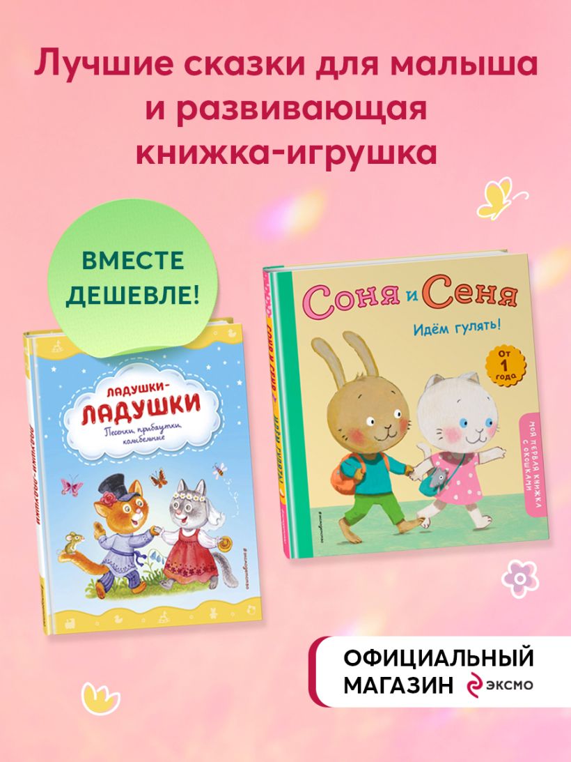В комплект вошли две интересные и полезные книги для малышей: "Соня и Сеня. Идём гулять!" и "Ладушки-Ладушки. Песенки, прибаутки колыбельные". Увлекательные книжки с добрыми картинками помогут детям развить мелкую моторику, память и запустить речь.