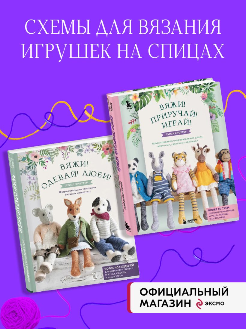 В комплект вошло 2 книги: Вяжи! Одевай! Люби! Очаровательная компания вязаных животных. Более 40 моделей для вязания на спицах игрушек, одежды и аксессуаров + Вяжи! Приручай! Играй! Новая компания очаровательных диких животных, связанных на спицах. Более 40 схем для вязания на спицах игрушек, одежды и аксессуаров