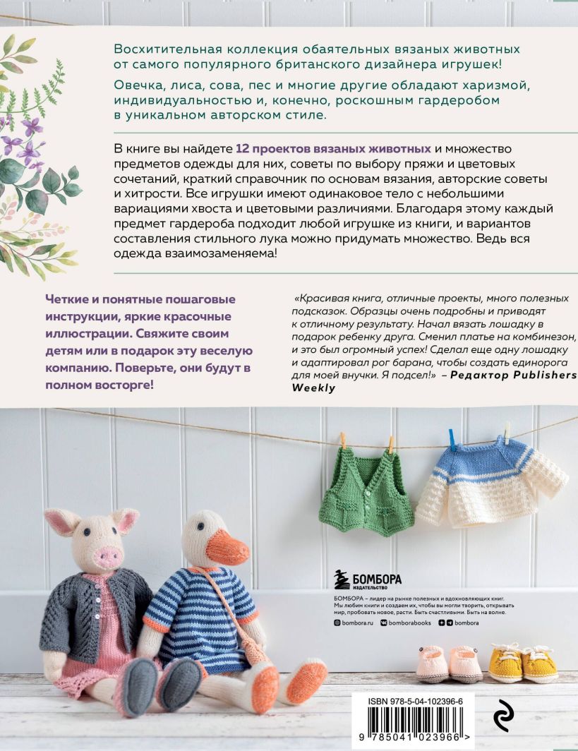 При виде этих симпатичных мордашек трудно не улыбнуться! И руки сами потянутся к спицам, чтобы связать лисичку, овечку или совушку своему ребенку или в подарок друзьям! Каждая зверушка со своим характером, выражением мордочки. А еще она одета по последней моде! Уникальность этой коллекции в том, что тела у всех игрушек одинаковые, поэтому вариантов составления гардероба может быть сколько угодно, ведь любой предмет одежды подходит каждой из них! Дети будут в восторге от увлекательной игры с переодеваниями. Родители получат массу удовольствия от процесса работы с этой подробной и понятной книгой, в которой создание каждого зверя сопровождает пошаговая инструкция. А от иллюстраций просто невозможно оторваться!