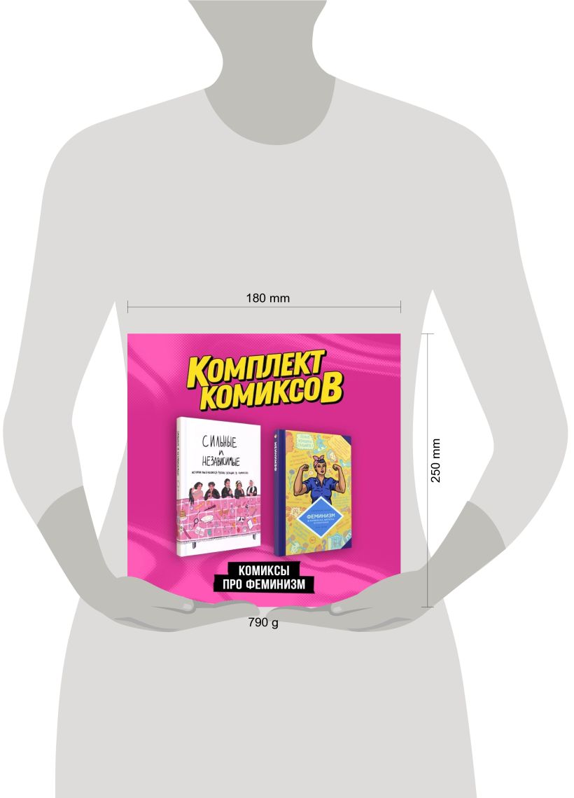 История феминизма и его главные лица в комиксах. В комплект входят сборники "Сильные и независимые. Истории выдающихся русских женщин в комиксах" и "Феминизм в комиксах, цитатах и слоганах".