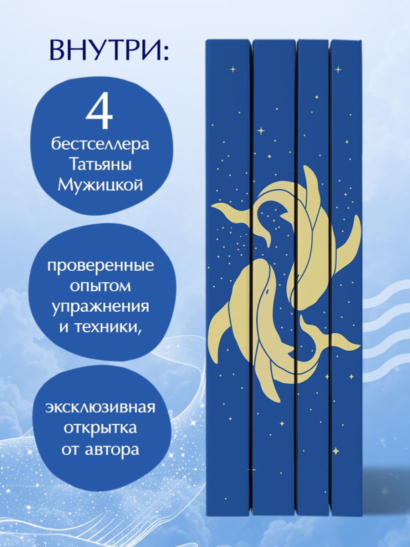 Лимитированная коллекция подарочных книг Татьяны Мужицкой. «Теория невероятности», «Мне все льзя», «Роман с самим собой» и «Брать, давать и наслаждаться» — это книги, которые исполняют желания. Они учат мечтать, исполнять желания, находить призвание и наполнять жизненным ресурсом.