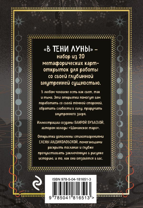 - Подарок — метафорические открытки «В тени Луны» от художницы-автора «Шаманского Таро» Баиры Буваевой, с исцеляющими стихами. 20 атмосферных карт помогут пройти путь принятия и трансформации — для работы с внутренними вопросами, вдохновения или как стильный подарок близкому человеку.