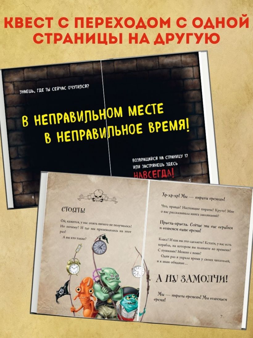«Маленькая злая книга» приготовила для тебя новый сюрприз! На этот раз дело не ограничится жуткими историями и сложными головоломками, ведь теперь она собирается ПУТЕШЕСТВОВАТЬ ВО ВРЕМЕНИ! Да-да, она утверждает, что с помощью волшебства сможет перенести кого угодно в доисторическую эпоху и в далёкое будущее! Правда, для этого ей понадобится умный, смелый и вкусный читатель — то есть ты! Если ты не боишься заблудиться в веках, повстречать пиратов времени и огромных динозавров, а также готов заглянуть в двадцать второй век, то поторопись! «Маленькая злая книга» уже ждёт тебя!