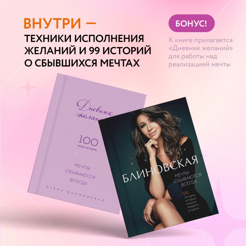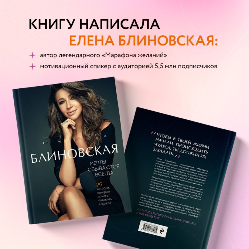 Первый книжный проект Елены Блиновской «Мечты сбываются всегда» — это книга и Дневник Желаний в одной упаковке. Елена Блиновская — не просто создательница знаменитого «Марафона желаний», она — коуч международного уровня и неординарный учитель мотивации. В новом проекте она делится уникальным методом осуществления желаний и личной историей сбывшейся мечты. В книге дано много правил, благодаря которым вы можете воплотить задуманное. Это своего рода навигационная карта жизни, используя которую, вы окажетесь на новом уровне.