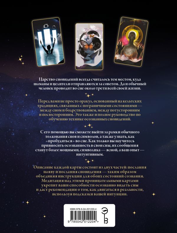 - Колода «Оракул осознанных сновидений» (44 карты + большое руководство) — мистический проводник в мир пограничных состояний. Основанный на кельтских традициях, этот Оракул учит осознаваться во сне, читать символику и работать с архетипами. Каждая карта соединяет «послание наяву» и «послание сновидения», открывая подсказки для обоих состояний сознания. В руководстве помимо толкования каждой карты — техники медитации, советы по анализу снов и уникальные практики, которые усилят вашу интуицию.