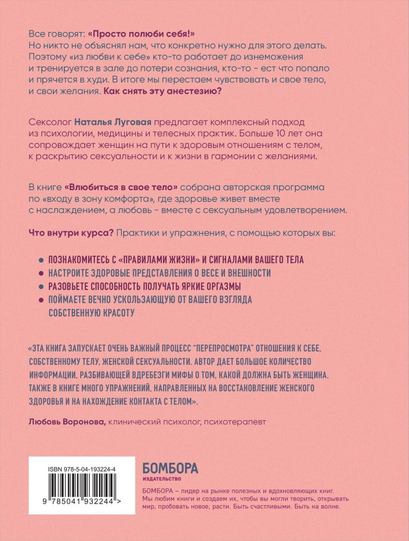 Сексолог Наталья Луговая предлагает комплексный подход из психологии, медицины и телесных практик. Больше 10 лет она сопровождает женщин на пути к здоровым отношениям с телом, к раскрытию сексуальности и к жизни в гармонии с желаниями. В книге «Влюбиться в свое тело» собрана авторская программа по «входу в зону комфорта», где здоровье живет вместе с наслаждением, а любовь — вместе с сексуальным удовлетворением.