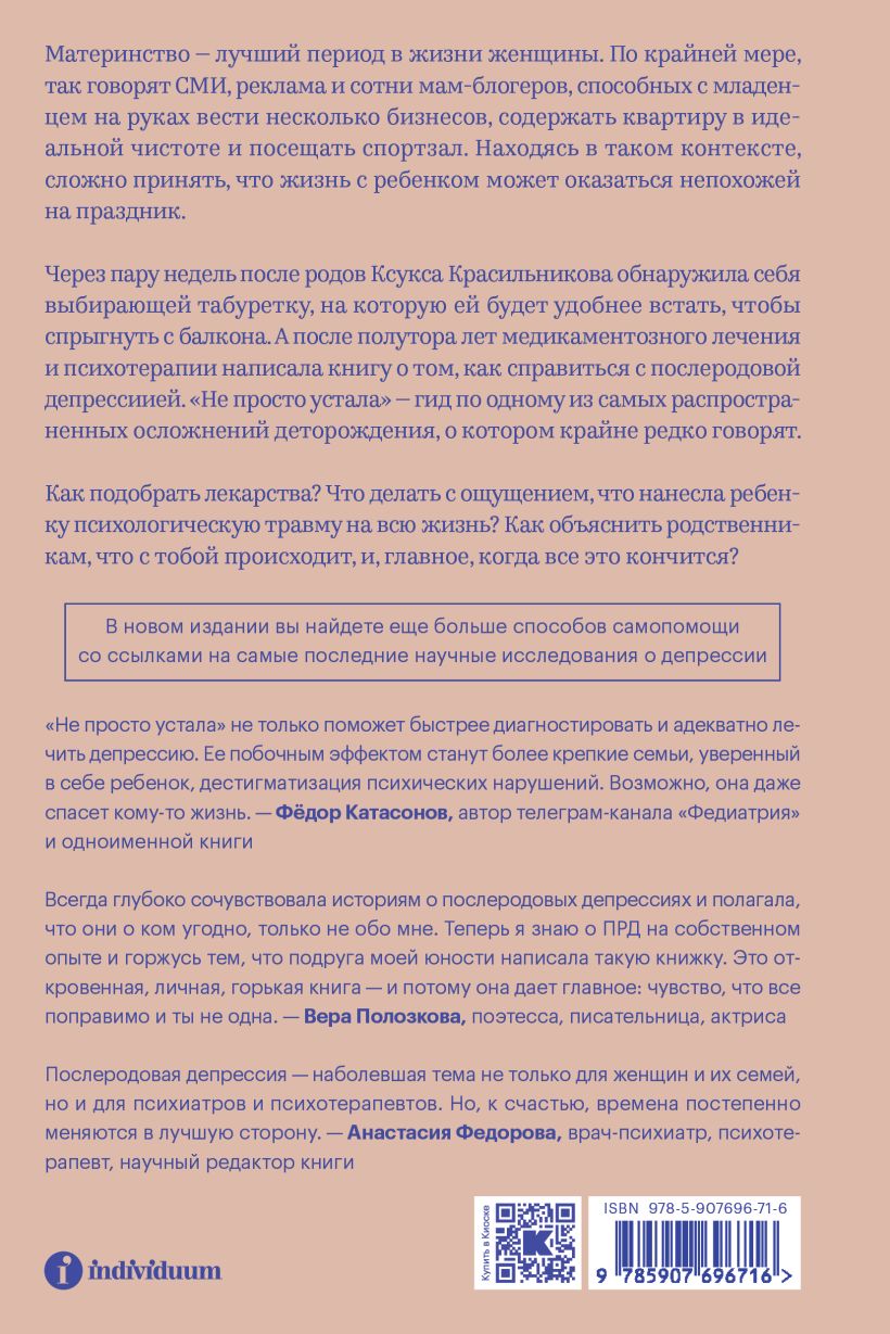 Не просто устала: "Материнство — лучший период в жизни женщины. По крайней мере так говорят СМИ, реклама и сотни мам-блогеров, способных с младенцем на руках вести несколько бизнесов, содержать квартиру в идеальной чистоте и посещать спортзал. Находясь в таком контексте, сложно принять, что жизнь с ребенком может оказаться непохожей на праздник. Через пару недель после родов Ксукса Красильникова обнаружила себя выбирающей табуретку, на которую ей будет удобнее встать, чтобы спрыгнуть с балкона. А после полутора лет медикаментозного лечения и психотерапии написала книгу о том, как справиться с послеродовой депрессией. "Не просто устала" — гид по одному из самых распространенных осложнений деторождения, о котором крайне редко говорят. Как подобрать лекарства? Что делать с ощущением, что нанесла ребенку психологическую травму на всю жизнь? Как объяснить родственникам, что с тобой происходит, и, главное, когда все это кончится?"