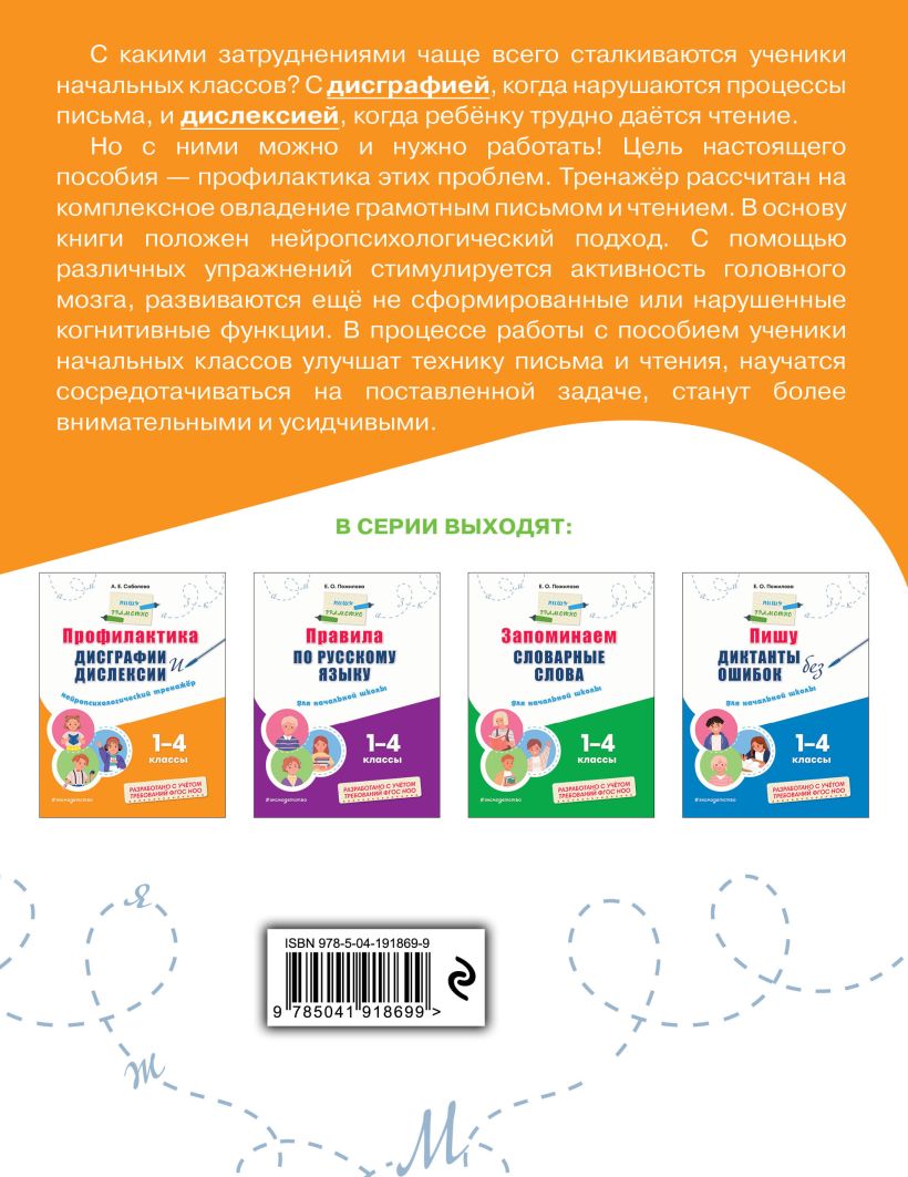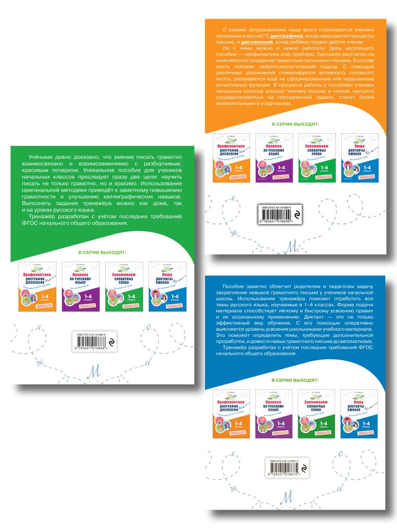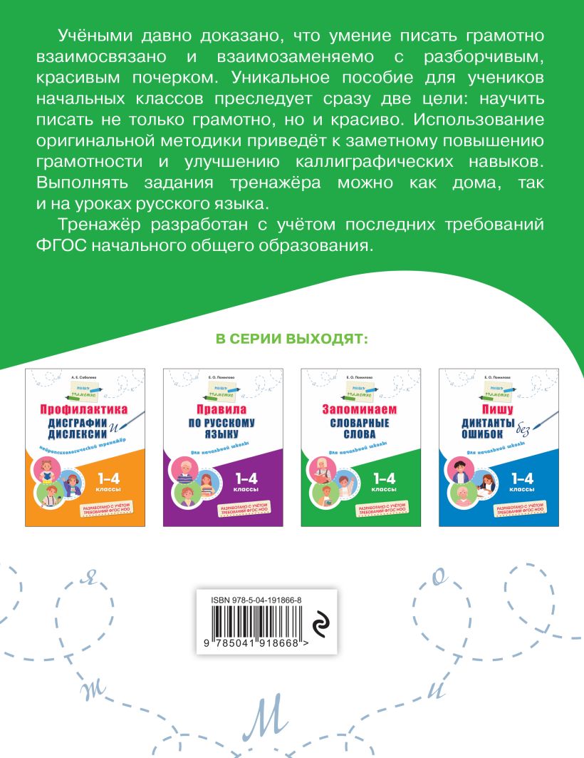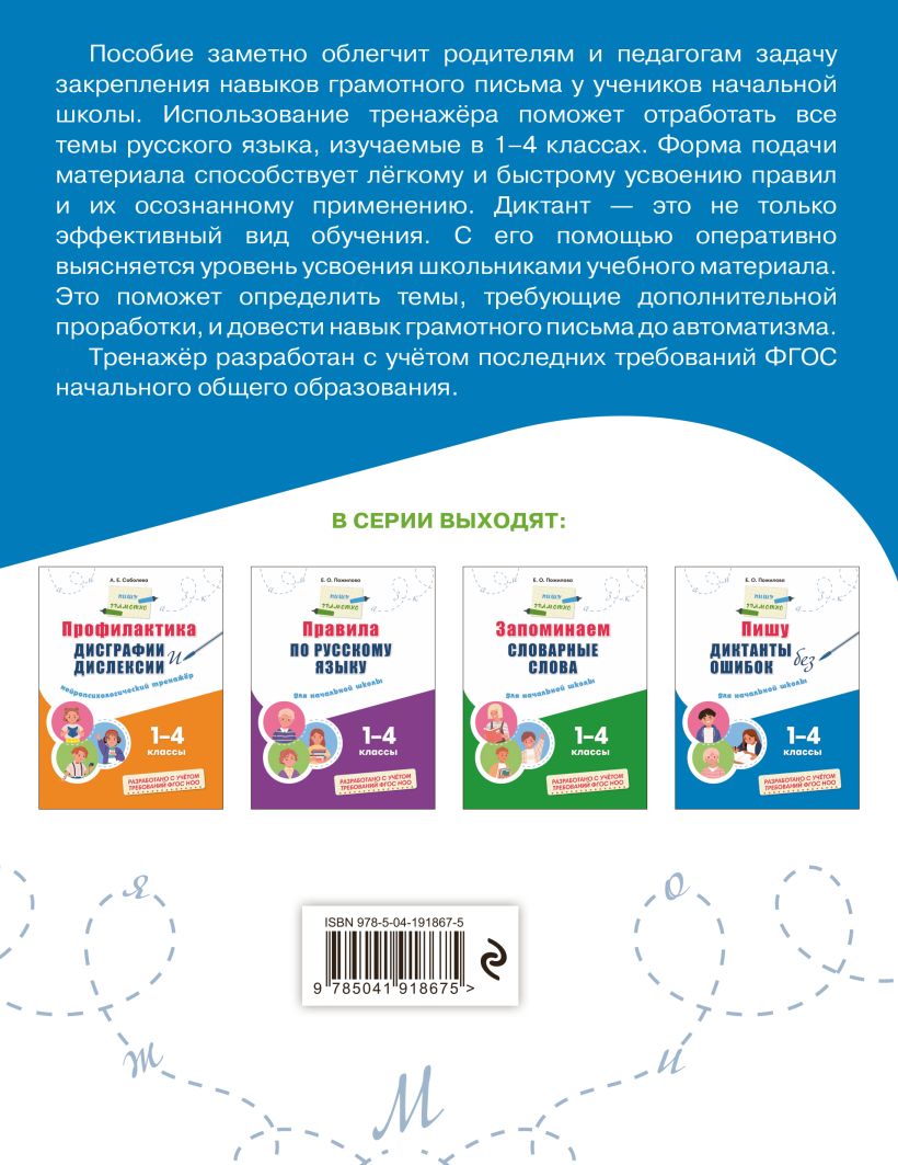 Комплект тренажёров для учеников 1—4 классов создан для всестороннего освоения русского языка и развития ключевых грамматических навыков. В него входят книги, направленные на формирование грамотного письма, запоминание словарных слов и укрепление орфографической зоркости. Задания составлены с учётом возрастных особенностей младших школьников и требований ФГОС, что обеспечивает эффективное усвоение материала. Регулярные занятия с комплектом помогут систематизировать знания, развить внимание, память и речь, а также уверенно применять правила русского языка на письме. Это практическая база, которая превращает обучение в интересный и результативный процесс, создавая прочный фундамент для успешной учёбы в дальнейшем.