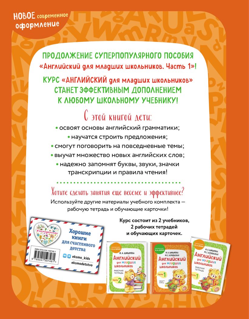 Учебник английского языка поможет познакомит младших школьников с основами английского языка, научит читать и писать по-английски. Основы грамматики объясняются несложно, коротко, понятным языком. Множество примеров и упражнений помогут запомнить новые слова и речевые конструкции, уверенно строить простые предложения, а также научиться правильно их применять. Авторская методика Ирины Шишковой помогает детям легко осваивать английский язык, постепенно переходя от простого к сложному. Аудиозаписи с эталонным произношением доступны по QR-коду.
