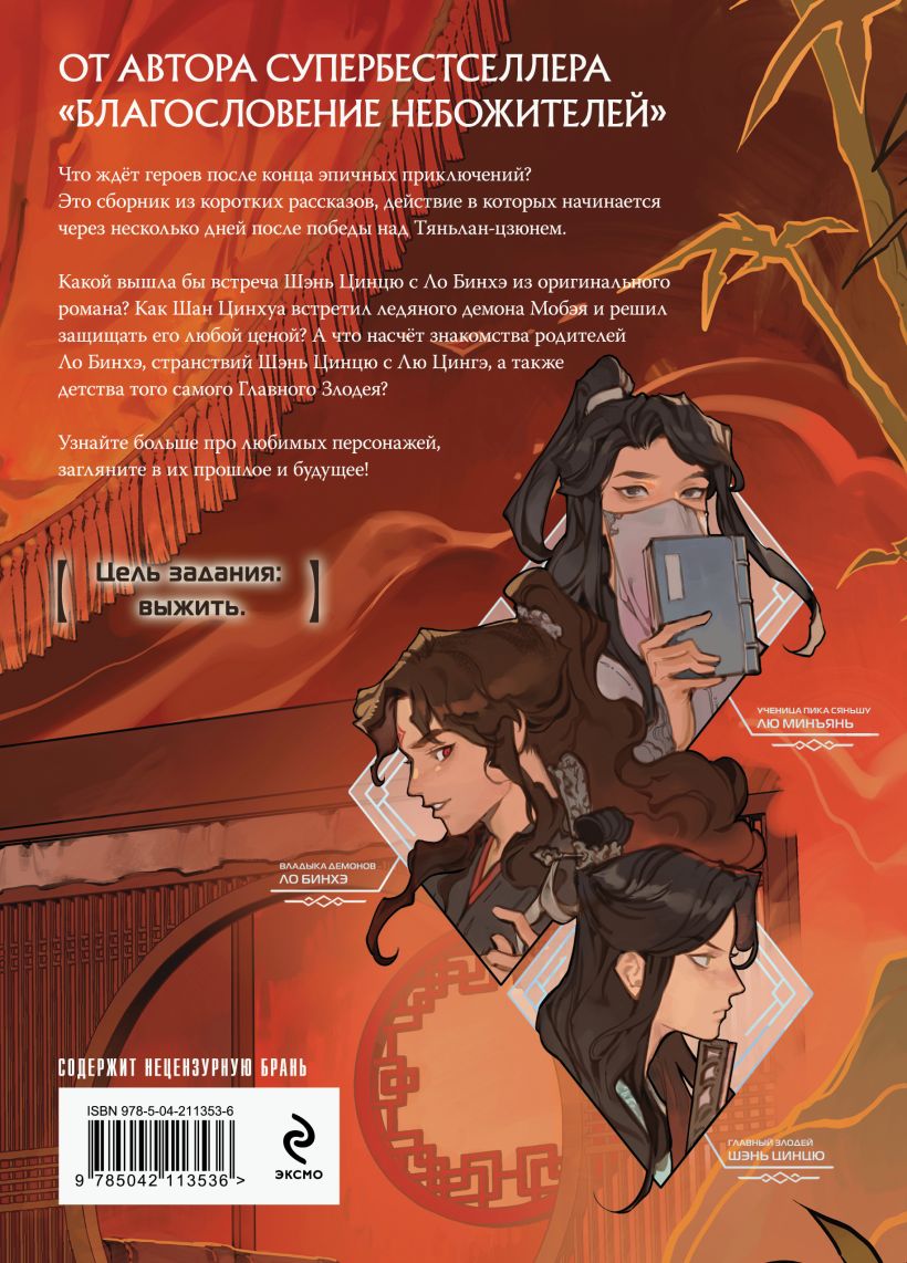 Что ждёт героев после конца эпичных приключений? Это сборник из коротких рассказов, действие которого начинается через несколько дней после победы над Тяньлан-цзюнем. Какой вышла бы встреча Шэнь Цинцю с Ло Бинхэ из оригинального романа? Как Шан Цинхуа встретил ледяного демона Мобэя и решил защищать его любой ценой? А что насчет знакомства родителей Ло Бинхэ, странствий Шэнь Цинцю с Лю Цингэ, а также детства того самого Главного Злодея? Узнайте больше про любимых персонажей, загляните в их прошлое и будущее! Впервые на русском языке! Новый цикл популярнейшей китайской писательницы Мосян Тунсю, автора супербестселлера «Благословения небожителей». Огромная международная фанбаза автора насчитывает миллионы читателей. Прекрасное издание: ляссе, суперобложка, переплёт с софт-тач покрытием, тиснение двумя видами фольги, полосные цветные иллюстрации + мини-комикс, цветные чиби-иллюстрации. Иллюстрации от популярной художницы Djuney9 (более 39 тыс. подписчиков в ВК) и чибики от RACCUN (более 17 тыс. подписчиков в ВК).