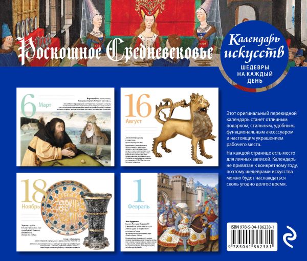 - Настольный календарь “Роскошное Средневековье” в футляре — каждый месяц раскрывает шедевры искусства прошлых веков, наполненные величием, деталями и уникальным историческим колоритом.