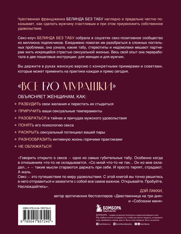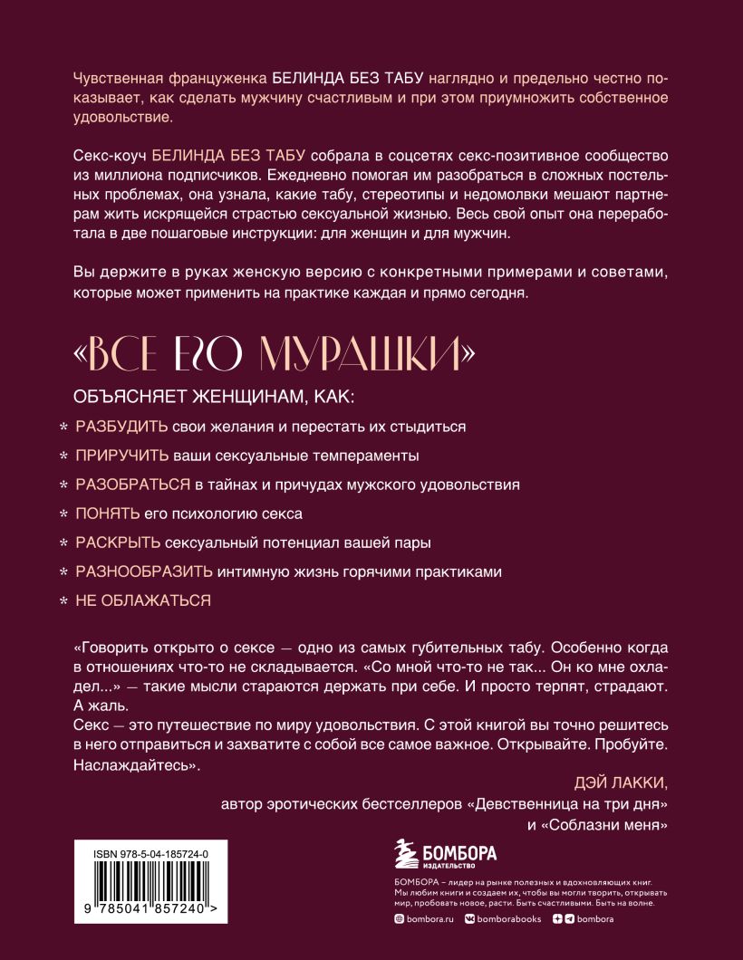 Секс-коуч Белинда Без Табу собрала в соцсетях секс-позитивное сообщество из миллиона подписчиков. Ежедневно помогая им разобраться в сложных постельных проблемах, она узнала, какие табу, стереотипы и недомолвки мешают партнерам жить искрящейся страстью сексуальной жизнью. Весь свой опыт она переработала в две пошаговые инструкции: для женщин и для мужчин.
