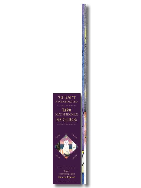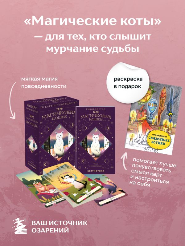 "Таро магических кошек" – приглашение открыть новое измерение, вдохновившись удивительными способностями и мудростью кошек. Колода автора, художницы и таролога Бетти Греко состоит из 78 карт. Красочные образы отсылают к классическому Таро Уэйта, что делает эту колоду понятной и открытой даже начинающим тарологам. К колоде прилагается полноцветное руководство с толкованием всех карт и с уникальными раскладами. Подарок к колоде — арт-терапевтическая раскраская "Сказочные котики" с 22 иллюстрациями Старших Арканов, которая поможет снять стресс и познакомиться с основной символикой Таро.