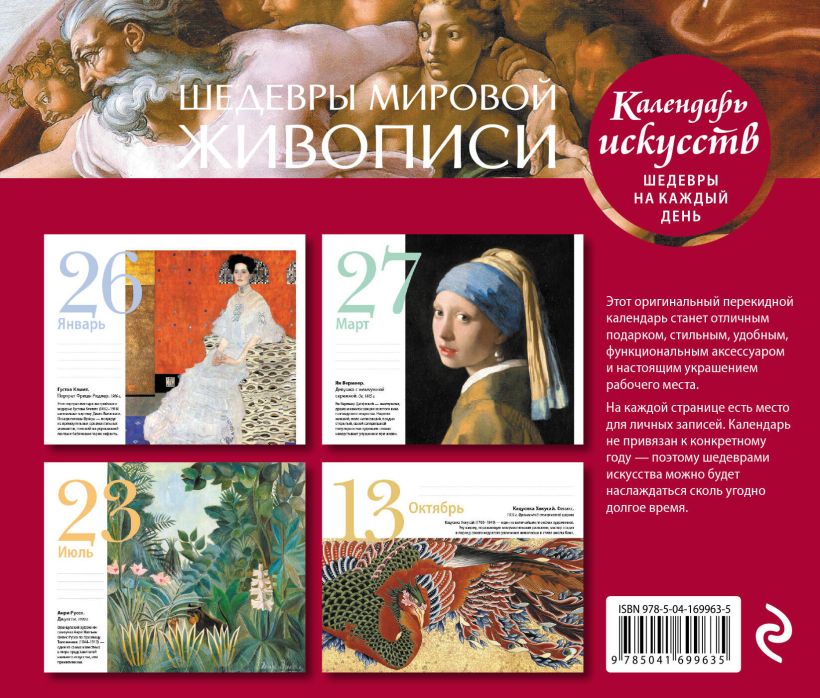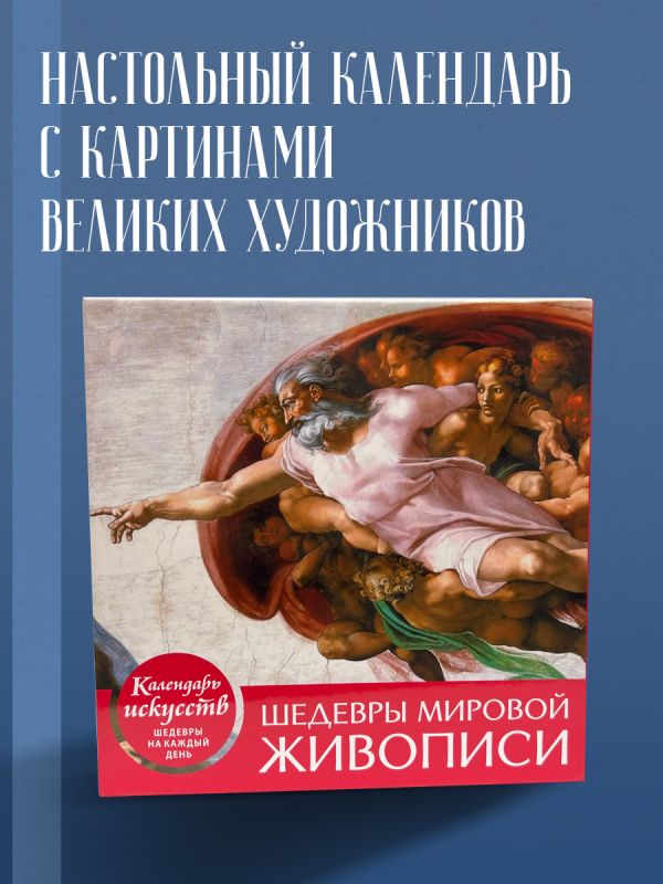 - Настольный календарь “Шедевры мировой живописи. Сотворение Адама” в футляре — культовое произведение Микеланджело и другие великие полотна будут сопровождать вас круглый год, придавая планам особенную значимость.