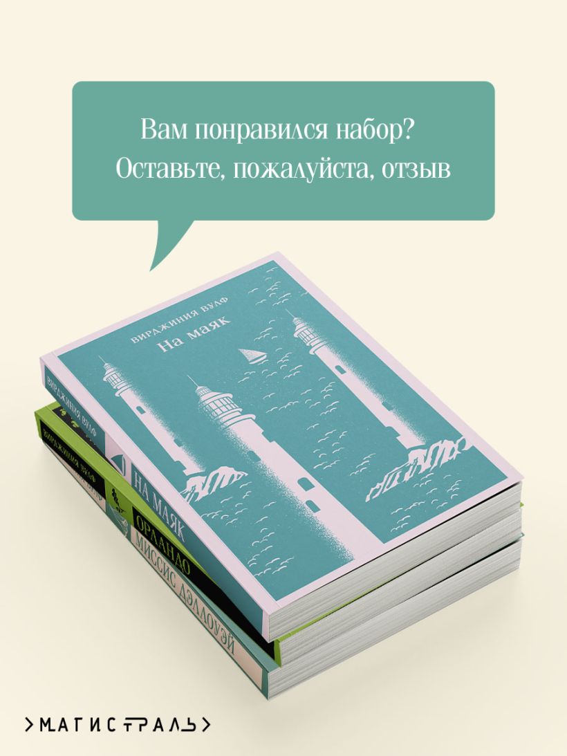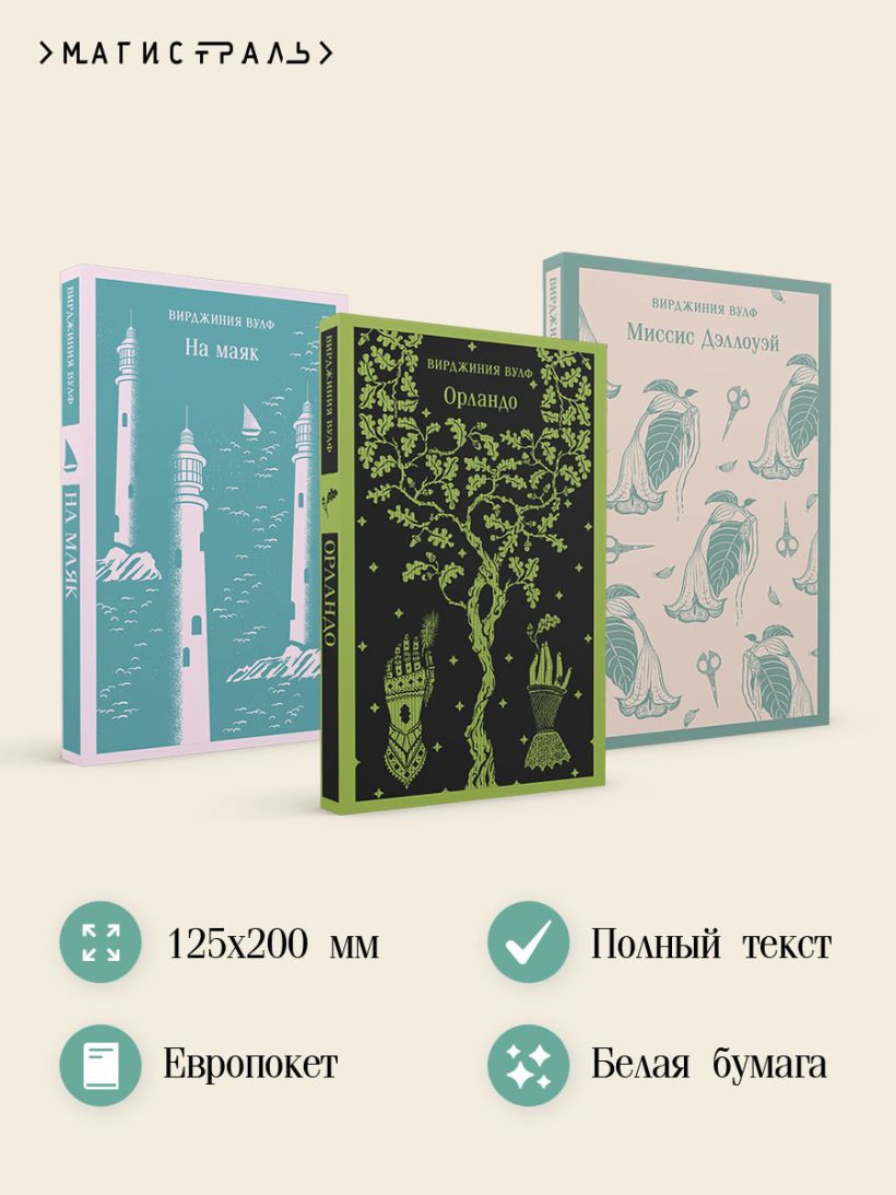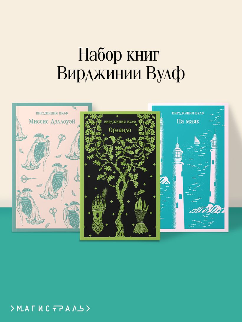 В комплект входят 3 книги Вирджинии Вулф: «Миссис Дэллоуэй», «На маяк» и «Орландо».