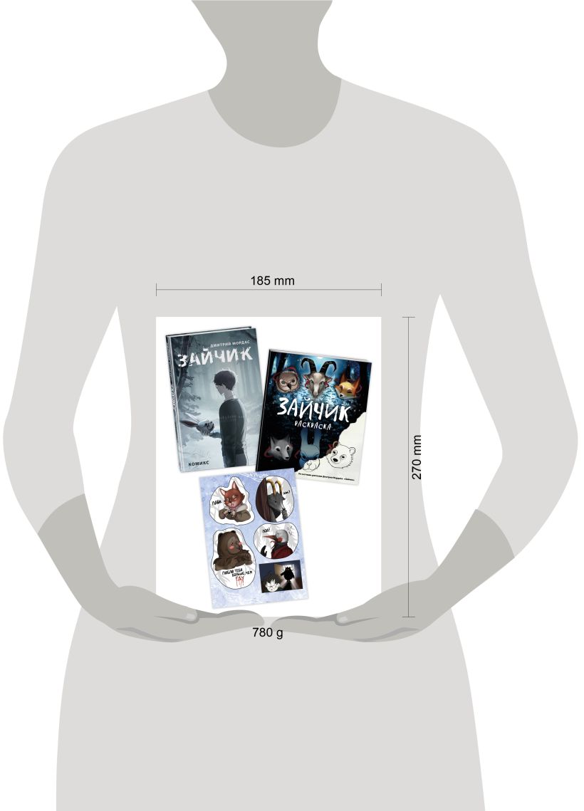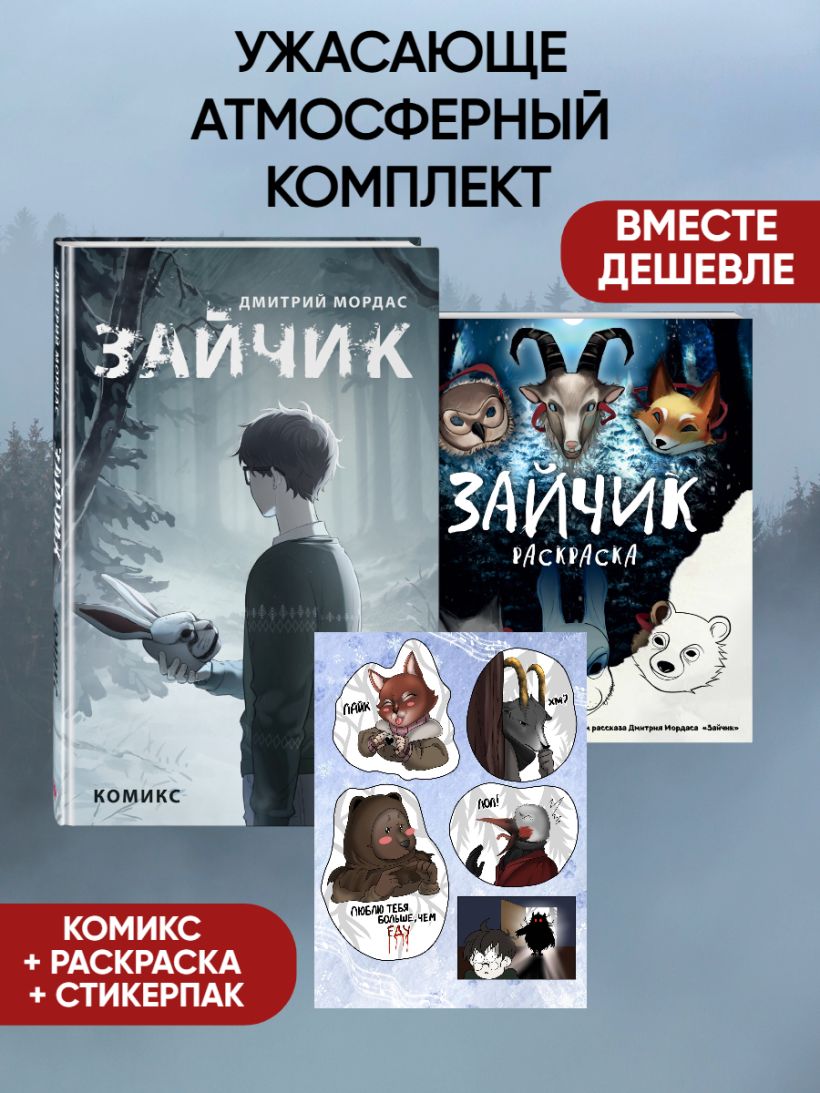 В комплект входит пугающий атмосферный комикс, раскраска с иллюстрациями, выстроенными по хронологии сюжета, и забавный стикерпак с героями рассказа!