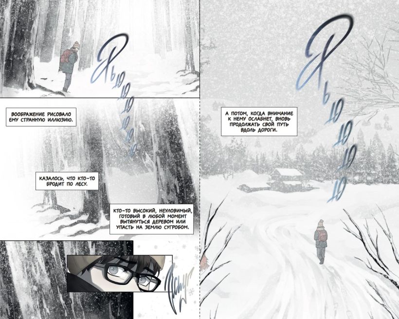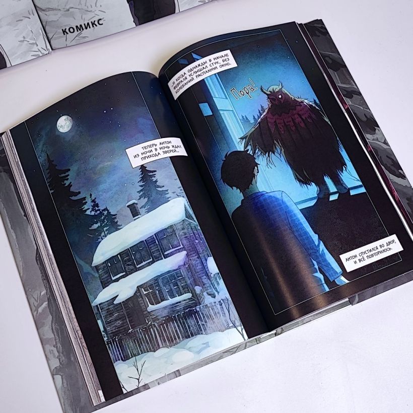 В комплект входит пугающий атмосферный комикс, раскраска с иллюстрациями, выстроенными по хронологии сюжета, и четыре стильных значка с животными из рассказа!