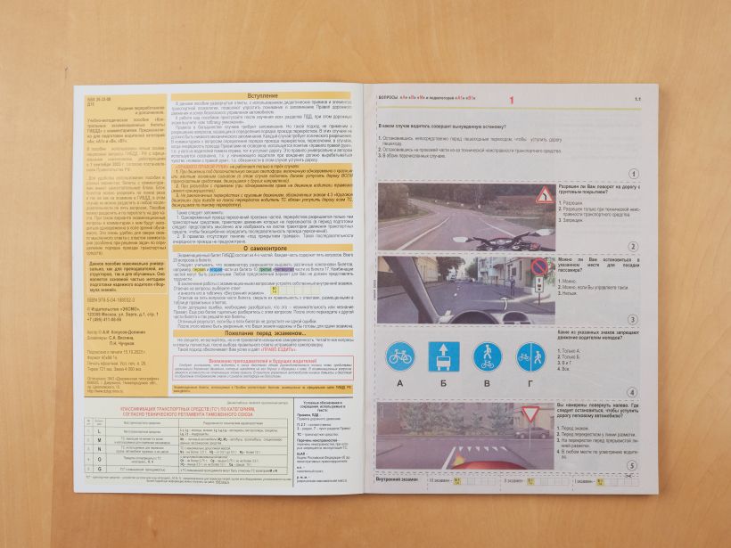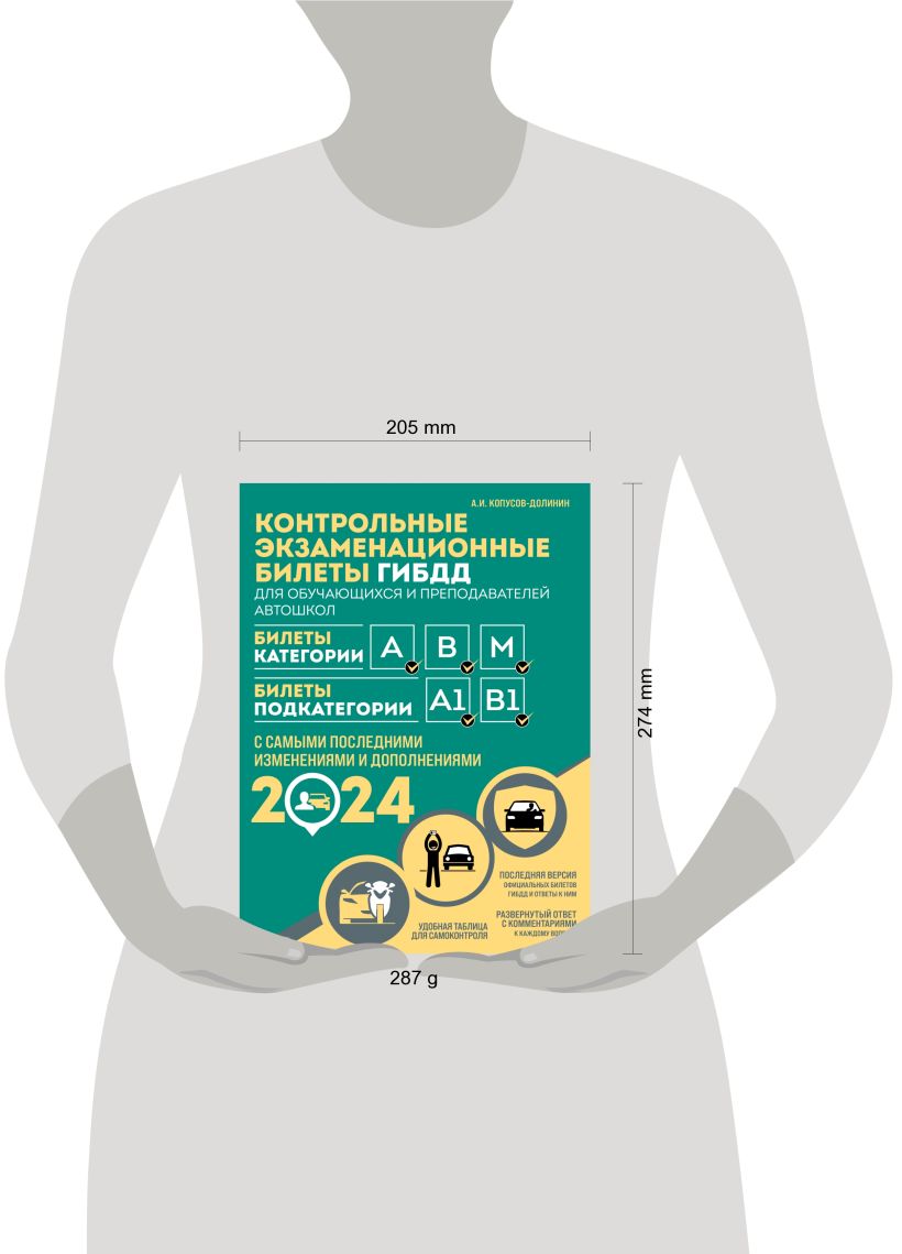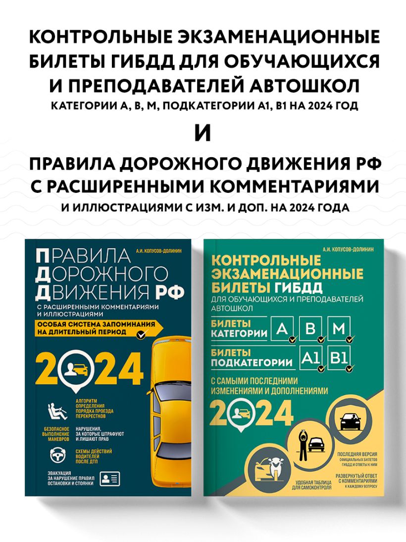 В комплект входят: ПДД с комментариями, фотографиями и 3D иллюстрациями (редакция 2024 г.), Экзаменационные билеты для сдачи экзаменов на права категорий "А", "В" и "M", подкатегорий A1, B1 (с изм. на 2024 год).